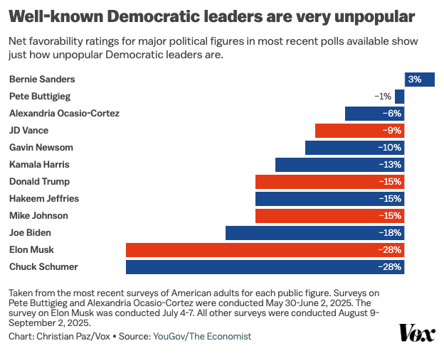 Here, Elliot Morris’s Strength in Numbers analysis of favorability of political figures is clear. While most politicians and figures are unpopular, Democratic ones are especially unpopular. |
