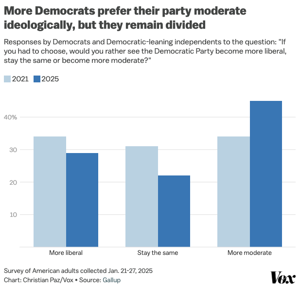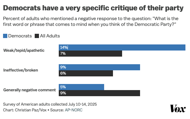 It’s a broad-based dislike: Republicans, independents, and disaffected Democrats are dragging down the party’s brand. But the reasons for this dislike are varied. Since there’s no one explanation for why everyone seems to hate the Democrats right now, it’s useful to break this question up into a few charts to visualize the complicated position of the Democratic Party in 2025. Democrats are frustrated with their party