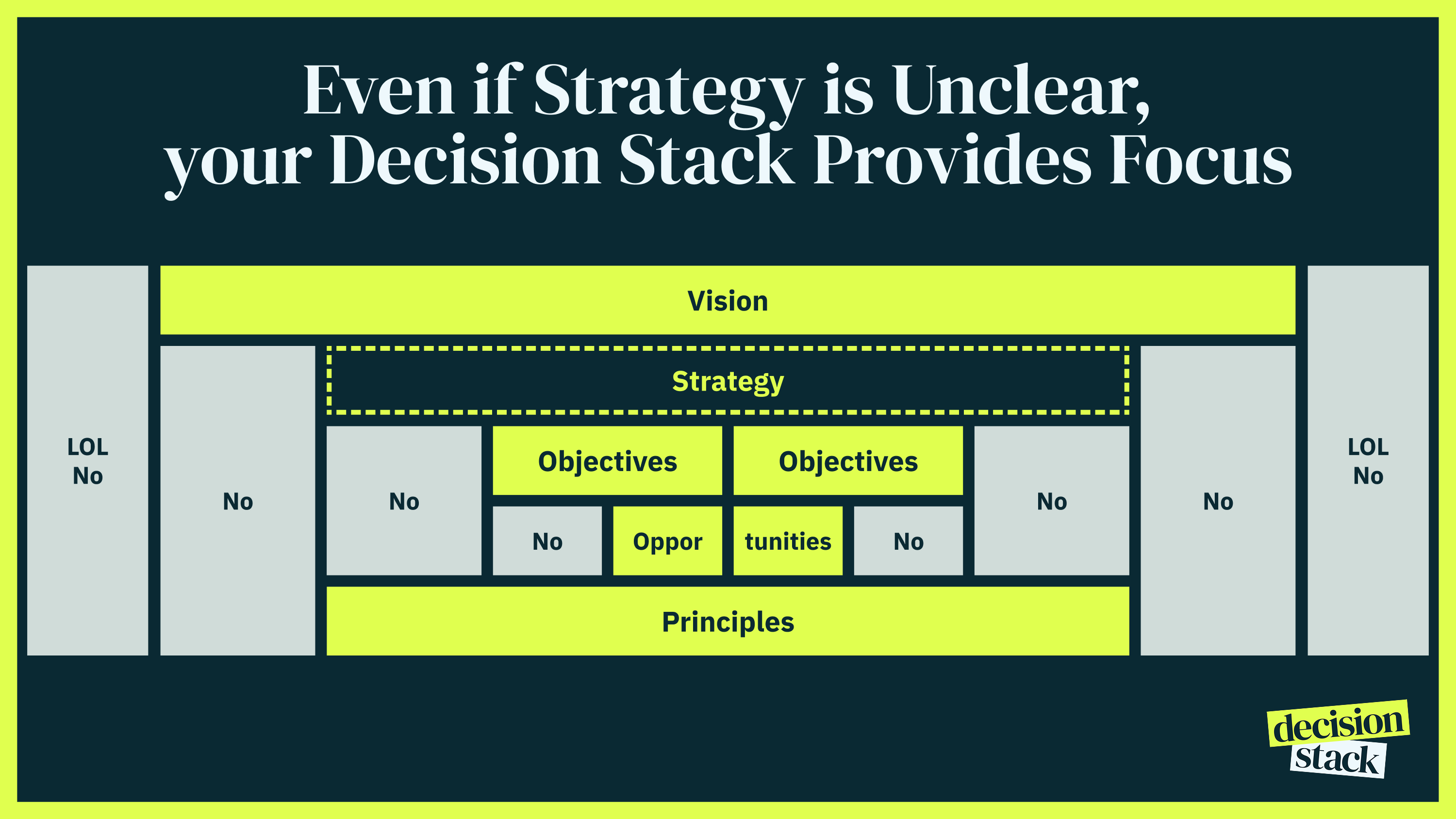 Suddenly, "grow 25%" has transformed from a vague directive into a rich landscape of strategic choices. The Strategic Filter: Which Opportunities Should We Pursue?Here's where most product teams get stuck. We've identified a dozen opportunities – now what? Before we dive into impact calculations or attempt a prioritisation framework like RICE, we need to make some strategic choices about which opportunities even deserve further investigation. Remember, you're not waiting for strategy from above anymore. This is you creating the strategy your organisation needs. Strategy is fundamentally about making choices to focus our limited resources. The question isn't just "which opportunity is biggest?" but "which opportunity aligns with who we are and who we want to be?" Even if your company's capital-S Strategy is lacking, you have more guidance than you think. Your Decision Stack – particularly your Principles – can act as a strategic filter. As I've written about in why your values are useless, Principles need to be specific and actionable. The best format? Even/over statements that force real tradeoffs: - "Simple for many even over powerful for a few"