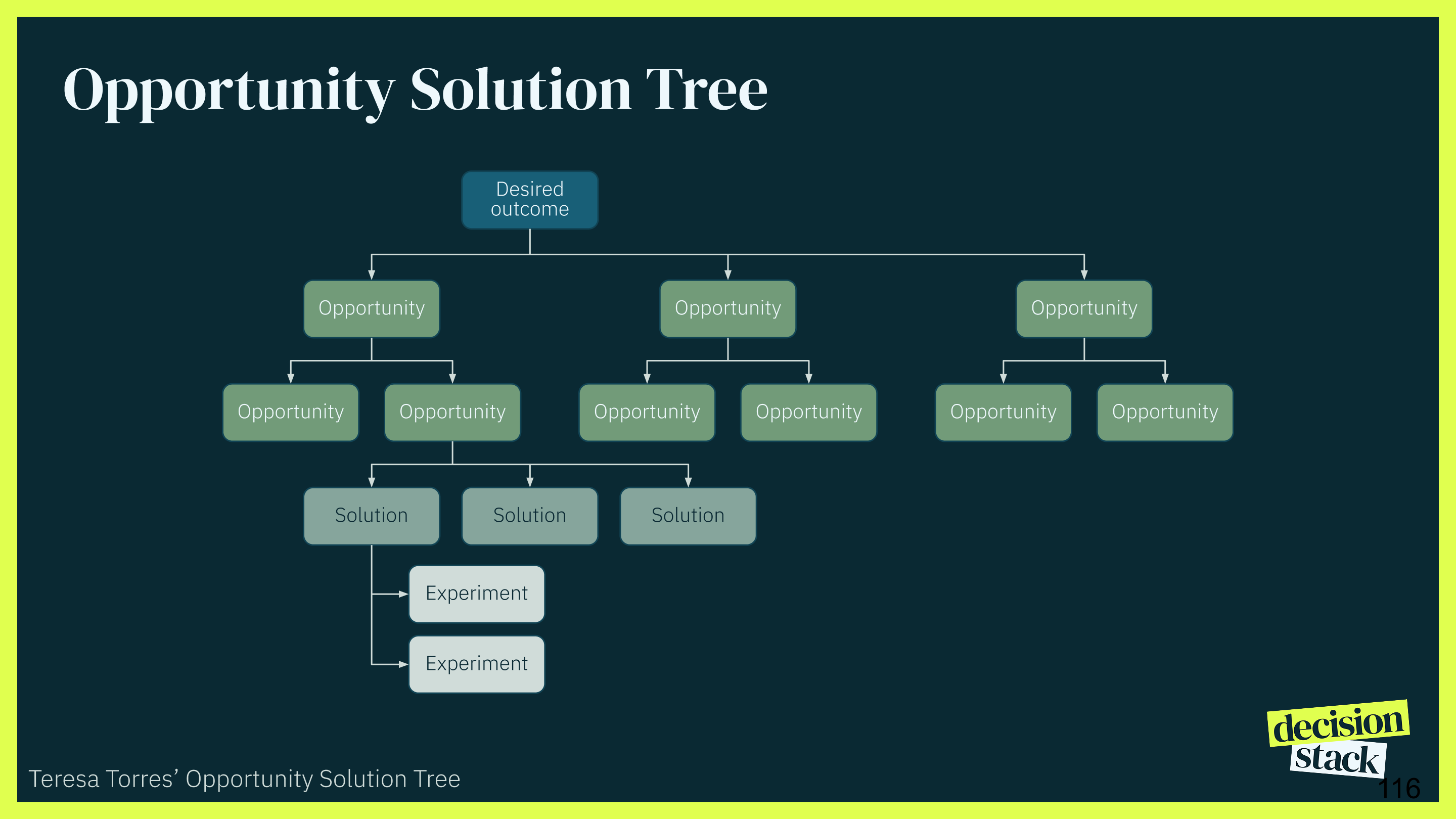Now you have context. You understand the scale of the challenge and the levers available to you. Your immediate instinct might be to optimise the onboarding flow you've been working on, or finally ship that enterprise feature customers have been requesting. Stop. Zoom out even further. This is where we need to map the entire opportunity landscape. Learning to Think in Opportunities, Not SolutionsThis is where Teresa Torres' Opportunity Solution Tree becomes your secret weapon. But before we dive into mapping, we need to rewire how we think. Most of us jump straight to solutions. We hear "grow 25%" and immediately think "new features," "better onboarding," or "price changes." Stop. These are solutions. We need to train ourselves to see opportunities first. An opportunity is an unmet customer need, a pain point, a desire – it's problem space, not solution space. Here's how to spot them: - Listen for struggle in customer language: "I wish I could..." "It's frustrating when..." "I waste time on..."