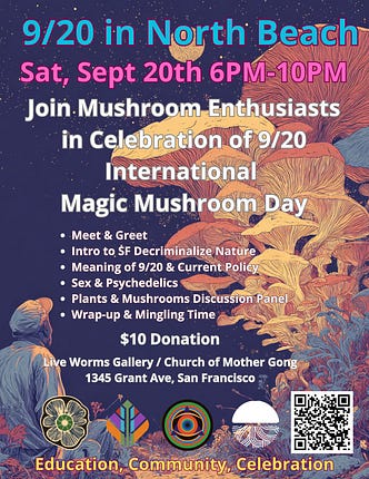 Before we get started I wanted to let you know that 9/20 (International Mushroom Day!) is on the way and we will be having a gathering in North Beach, San Francisco at Professor Seagulls Smart Shop to celebrate. We will have a host of distinguished speakers such as:
