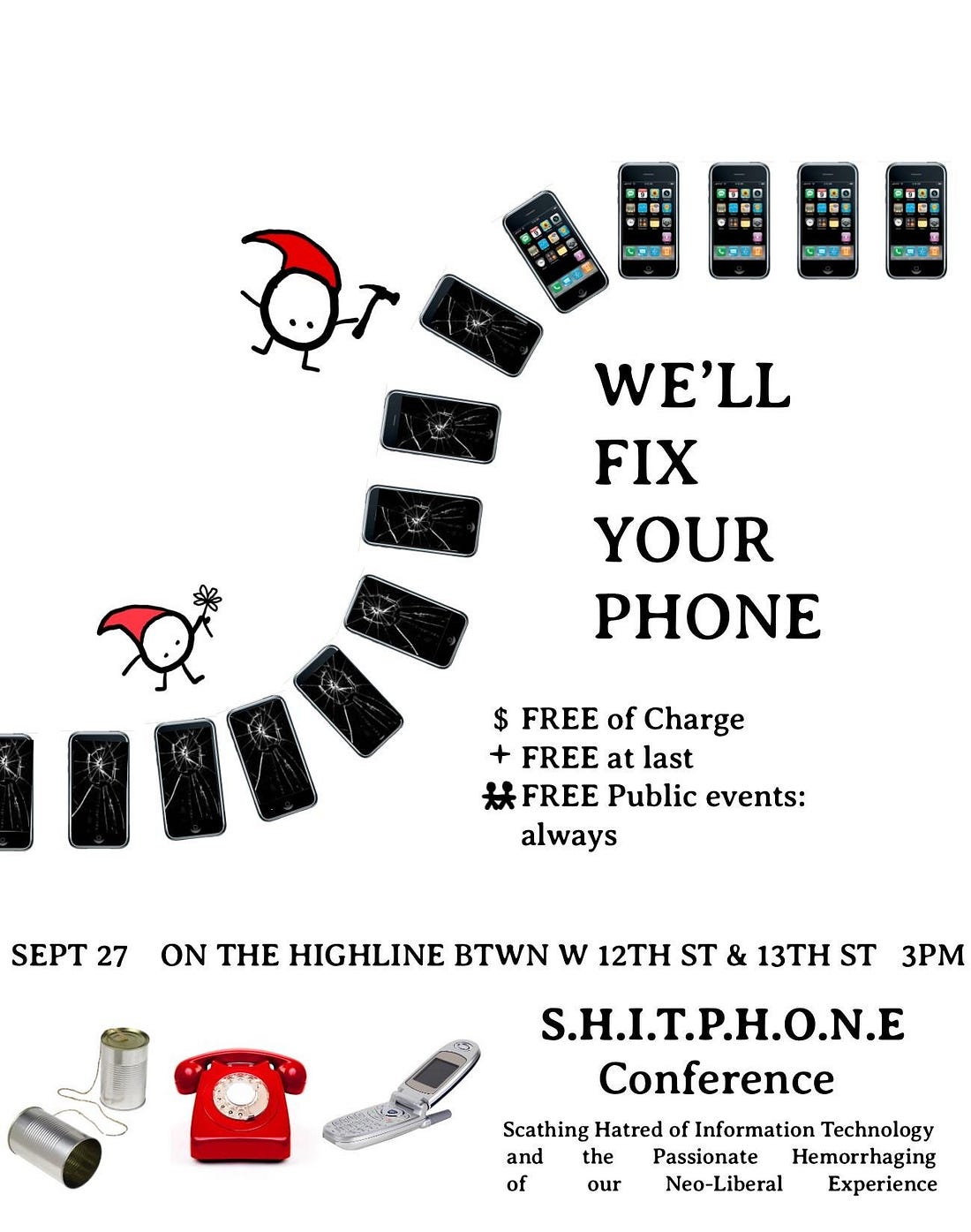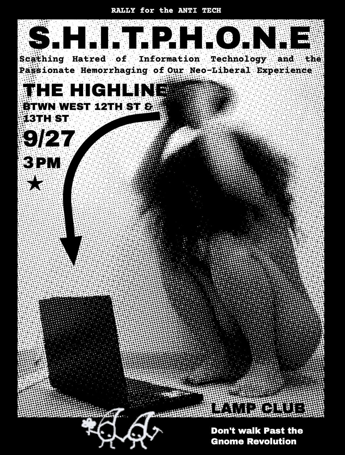 On September 27, the S.H.I.T.P.H.O.N.E. rally and march will begin at 3pm sharp on The High Line in Manhattan, between W. 12th and W. 13th Sts. S.H.I.T.P.H.O.N.E. stands for Scathing Hatred of Information Technology and the Passionate Hemorrhaging of Our Neo-liberal Experience. Hundreds are expected to take part in this carnivalesque collective grievance against technocracy. Soapboxes will be made available for people to take turns voicing their screeds against Big Tech. There will be surprise guest speakers, gnomes, chanting, bullhorns, song, a vigil for boredom, and last, but not least — tech smashing! Come join the parade!