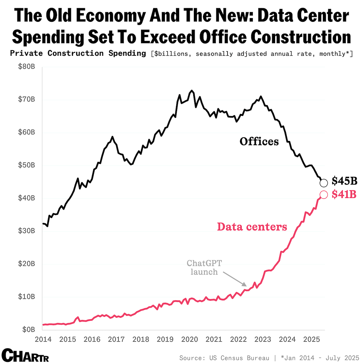 Hyperscaling: America is very close to spending more on building data centers than offices.