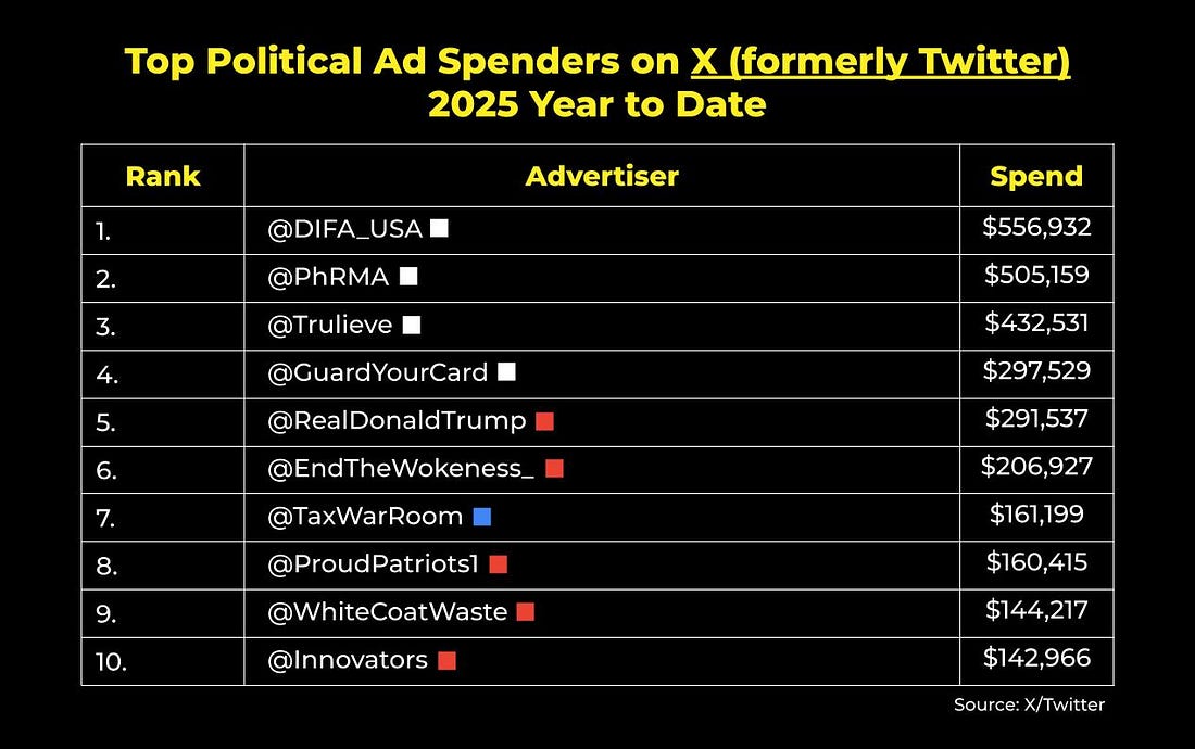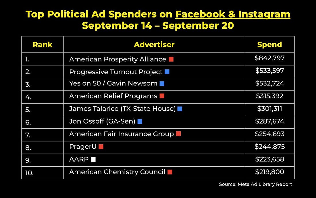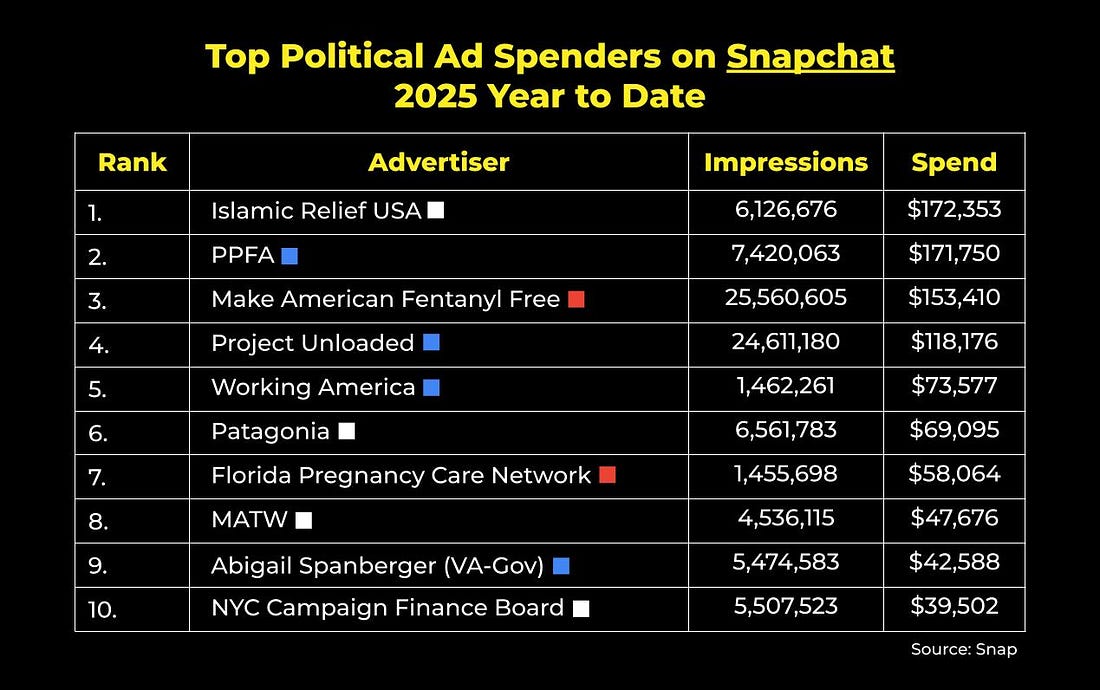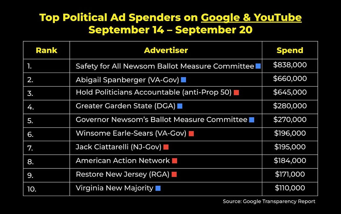Democrats Are Losing YouTube. Here’s How We Fix It.Also inside: A look at digital ad spend in TX, VA, and NJ, how progressive creators are already proving there's a path forward, and moreThis newsletter is sponsored by the donor acquisition approach that helps you turn $1 into $2. Hi everyone – I’m Ethan Kelly, a long-time FWIW reader, and guest author for today’s edition. I was an intern on the Kamala HQ team last year, and at 14 years old, I founded Let’s Talk Elections, a YouTube channel that built an audience of 200,000+ subscribers and generated over 100 million views — now, I work as a Lead Strategist for Luminary Strategies. For today’s FWIW, I want to offer my thoughts on the YouTube universe — and why Democrats are losing and what they can do to win. More on that below, but first… Digital ad spending, by the numbers:FWIW, U.S. political advertisers spent about $13.6 million on Facebook and Instagram ads last week. Here were the top ten spenders nationwide: James Talarico’s Meta ad spend continues to dramatically outpace his Senate primary opponent’s. This week, Colin Allred increased his Facebook and Instagram investments to $11,022 (nearly double what he spent last week)… but that’s still not even 4% of Talarico’s total. Meanwhile, political advertisers spent just over$5.9 million on Google and YouTube ads last week. These were the top ten spenders nationwide: With less than 40 days until Election Day, this week’s Google and YouTube advertising was heavily shaped by the two 2025 gubernatorial contests. In Virginia, Abigail Spanberger’s investments came out to more than triple that of her opponent, Winsome Earle-Sears. Meanwhile, New Jersey saw both the DGA and RGA pour six-figure sums into elevating their respective candidates. On X (formerly Twitter), political advertisers in the U.S. have spent around $7.5 million on ads in 2025. According to X’s political ad disclosure, here are the top spenders year to date: …and lastly, on Snapchat, political advertisers in the U.S. have spent around $1.6 million on ads in 2025. Here are the top spenders year to date: Tired of burning money with Care2 or Meta ads?