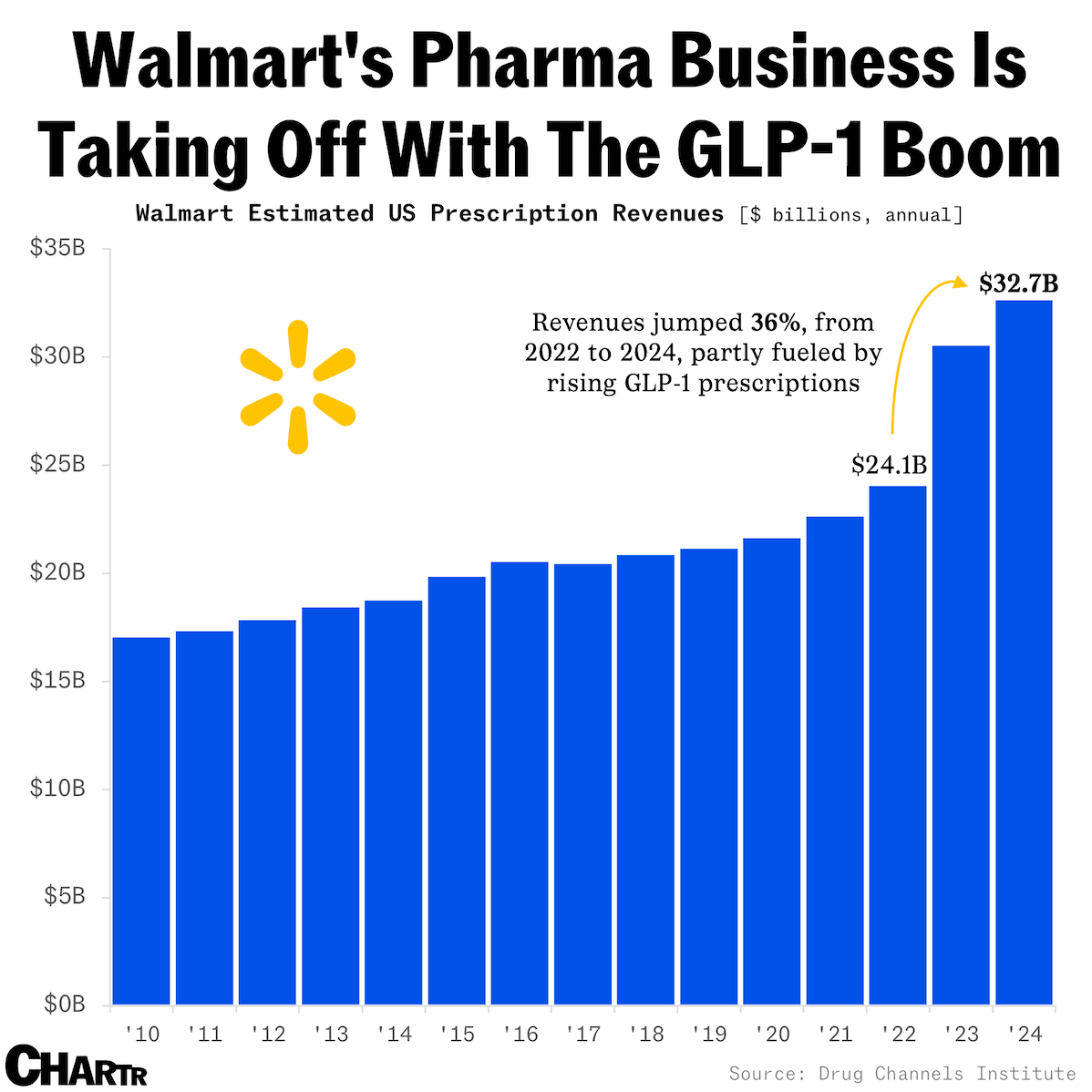 Walmart’s prescription revenue had been rising steadily for over a decade, averaging just 2.9% growth per year since 2010. That changed in 2023, when growth suddenly broke into the double digits after being lifted by the recent weight-loss drug boom; per the Drug Channels Institute, Walmart accrued an estimated $32.7 billion in prescription revenues last year, with its CFO citing GLP-1 sales as a major driver.