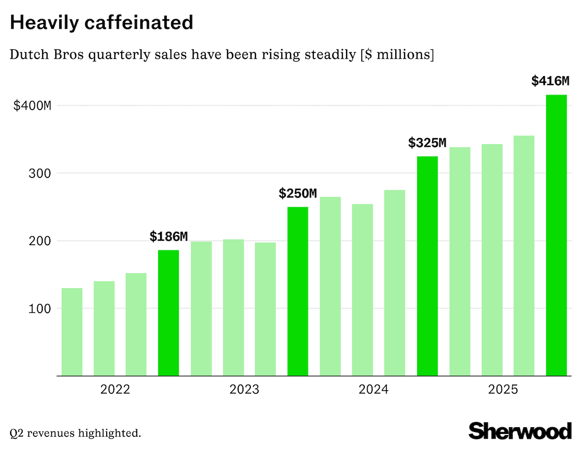 Recently, as Starbucks saw its same-store sales dip 2% year over year in Q2 2025, the biggest gainer (+6.1%) across the whole quick-service kingdom was Dutch Bros — an Oregon-born coffee chain where employees are sincerely called “broistas” and its menu has entire sections of “protein coffee” options, smoothies, and energy drinks with names like Tiger’s Blood and Kick in Da Face.