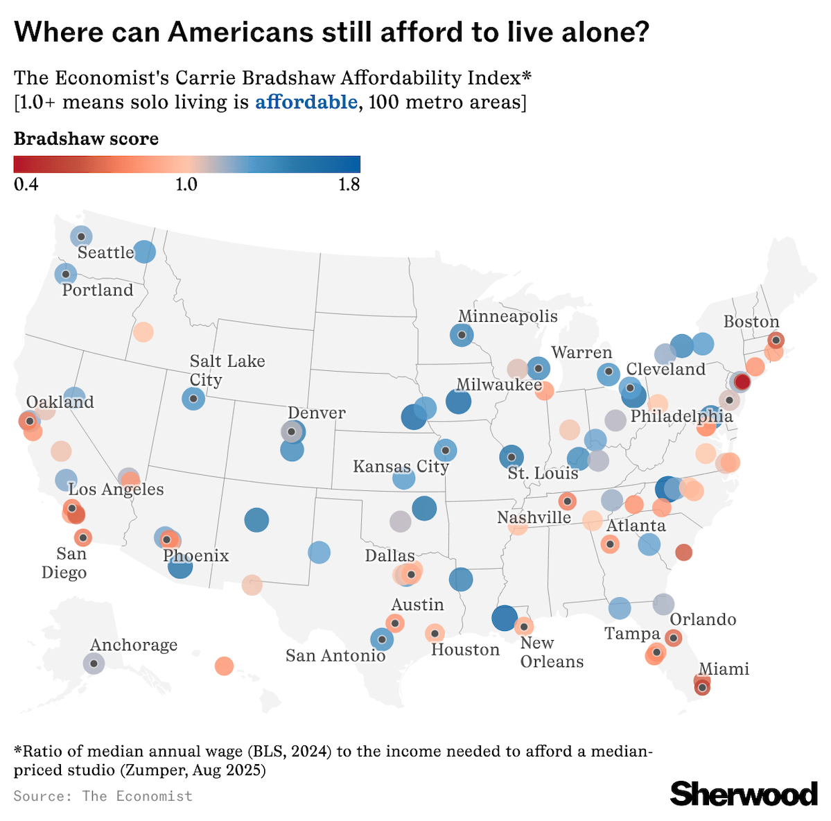 Solo living is getting pricier, per The Economist’s “Carrie Bradshaw Index” |
