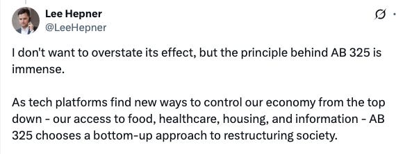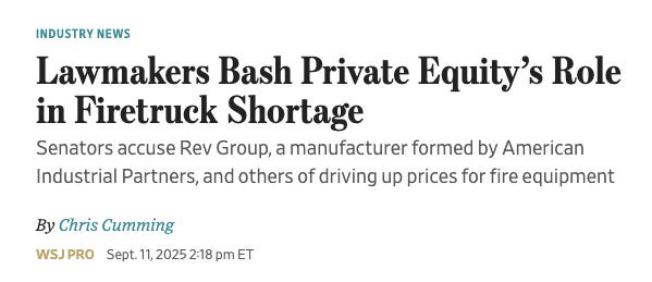 How to Overturn an OligarchyWe've had some real victories. The FTC is looking into fire truck monopolization, California passed a law against coercion machines, and lobbyists took a big loss last month. America is waking up.In 1815, John Adams wrote a letter to Thomas Jefferson about the American Revolution. “What do We mean by the Revolution?” he asked. “The War? That was no part of the Revolution. It was only an Effect and Consequence of it. The Revolution was in the Minds of the People, and this was effected, from 1760 to 1775, in the course of fifteen Years before a drop of blood was drawn at Lexington.” Adams cited the legislative records, the pamphlets, newspapers, and the public debates “by which the public opinion was enlightened and informed concerning the Authority of Parliament over the Colonies.” What Adams wrote has always stuck with me. Those guys fought a war against the most powerful empire in the world, and won, and they did so because they convinced each other a decade earlier, during deeply distressing economic times, that independence from a king was critical to their wellbeing and dignity as free people. And the revolution was the act of convincing, of gaining the self-confidence to declare independence, far more so than the violence of a war. They imagined a new society before they overthrew the old. I’ve been running BIG for six years, and that’s how I think about this newsletter and our movement. Liberty from concentrated power starts in our own minds, before it happens anywhere else. I believe in public education, because I believe in the public. I never expected to be writing a newsletter on monopoly power; I started writing BIG because I thought it would be a useful way to promote my book Goliath, which was a history of fights over monopoly in the 20th century, and a tacit way to explain to Democrats that President Obama had turned his back on traditional democratic principles. But it turns out there’s a hunger for writing and analysis of how our commercial society works, so I kept it going. Since the start of BIG, we’ve covered a pandemic, two Presidential elections, a revival of antitrust law, and several major bank bailouts. Despite some very important victories, the trends have been bad in general. The number of billionaires in America has increased by about 25%. The economy is now dependent on consumer spending by the wealthy, as well as an obvious AI bubble with its direction concentrated in the hands of between ten and twenty men. There are many reason for this oligarchical control, but a key one is that since the 1970s, the people have allowed it. We lost our skepticism towards concentrated power, and became deeply confused about why our society is less free. But I am going to offer a reason for optimism. I believe the American people are learning about the real sinews of power. And there’s data backing that up. Since 2006, every election but one has seen a change in one or both houses of Congress, or the Presidency. And popular faith in big business has collapsed. One law firm that advises on jury selection does polling, and recently found that “the jury landscape has fundamentally shifted. 72% of Americans now see their role as sending messages to corporations—a dramatic increase from 2022.” Americans are seeing the corruption of their society, and they don’t like what they see. That’s good. And they are now realizing that one center of the problem is corporate power. Such a shift in the mind of the public doesn’t happen all at once. There are over three hundred forty million Americans, each with our own lives and interests and communities. But over the past six years, we’ve been watching in real time, like tiny light bulbs turning on, as different communities learn to see power and coercion they had formerly imagined was part of nature. Over the past month, it happened to “row crop” farmers, angrily watching as their government bails out Argentina’s soybean exporters while their input costs go up. It happened to video gamers last week, when Microsoft did to them what it said it would not: raise prices and lay off game developers after buying Activision. Lots of gamers believed Microsoft was a good actor, now they do not. The lightbulb went on. A few years ago, it was people in the cheerleading world, who were dealing with the monopoly Varsity Brands. Cattle ranchers, pharmacists, dentists, chicken farmers, Hollywood producers and talent, Uber drivers, and app developers are starting to get it on a fundamental level. Anti-monopolists in the defense world, metal producers, and even anti-corruption businesses are emerging. At BIG, we make an argument about politics and commerce. We do the podcast Organized Money, we run Big Tech on Trial to cover the antitrust cases in detail. What we say is garbed in technocratic clothing around markets, but the basic principle is a simple and eternal truth. Arbitrary coercion is immoral. And that principle is enormously powerful, especially when matched to the rule of law. Today, the anti-monopoly language finally exists for the dissatisfied multitude to describe the world they are seeing in useful ways. We haven’t built a politics designed to take this energy and turn it into a majority, but we will. As John Adams noted, revolutions start in the minds of the people. Ok, so now I want to discuss three small victories that the community around BIG has helped foster. In 2021, I decided to accept paid subscriptions, though nearly all the content is free. So part of what we’ve been able to do is because we have a small amount of capital. Here’s victory number one: 1) Firefighters Get Mad at MonopoliesLast year, BIG brought on antitrust lawyer and researcher Basel Musharbash to do investigative reporting. In January, BIG published a piece on how a private equity engineered fire truck roll-up worsened the costs of the Los Angeles fires. In September, a Senate subcommittee led 