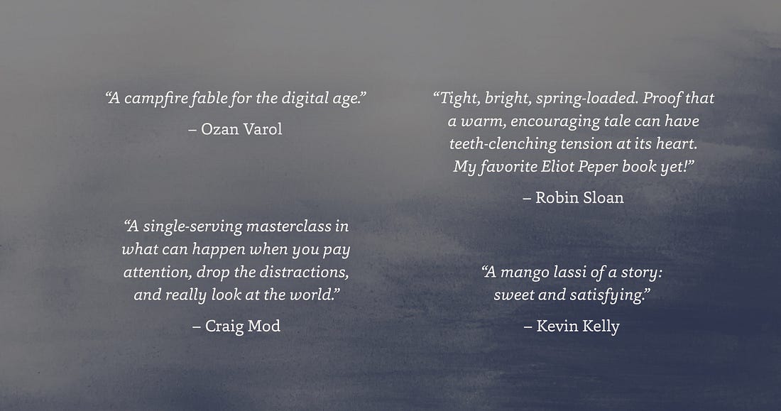 After two years of work, my new book is out today. Ensorcelled is a coming-of-age adventure about a boy who goes on a camping trip that changes his life, opens his mind, and rewilds his attention. This story was new territory for me and I had to brave many forking paths and dead ends before finding my way to the heart of it, but, in the words of the protagonist, “the only voyages worth embarking on are those that venture into the unknown.” Having returned from the aforementioned voyage with this singular little book clutched in my hands, I am happy to report that Ensorcelled is the best thing I’ve written. If you’re new to my writing, start here. If you’re a longtime reader, get ready for a journey you won’t soon forget. I can’t wait to hear what you think. You can buy it now in beautifully designed paperback and Kindle formats. The audiobook (narrated by me!) will go live shortly. If you want a signed copy, you can order one directly from me and I will personally sign and send it to you. Tam can’t wait to play Ark of the Shadow Moon, the hotly anticipated new game from Clandestine Studios. But when his parents force him to go on a camping trip, he discovers that the mountains wield their own magic, and that while magic offers you everything, it asks everything of you in return. At just 90 pages, Ensorcelled is a one-sitting read that will suck you in, make you think, and leave you changed. Authors write books, but readers determine their commercial and cultural impact. Launch day is the pivotal handoff. I may have written Ensorcelled, but its fate now lies in your eminently capable hands. If you’d like to help give this little book a boost out of the gate, here are three things you can do that make a surprisingly big difference: