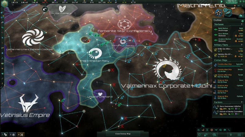 (I hope astronautical engineers of the future continue to read Hitchhiker’s Guide To The Galaxy. While it remains in print, I don’t think we need to panic just yet.) But staying with the theoretical physics - there’s a huge problem there too. Any superluminal (FTL) model of travel will have to overturn our current understanding of the nature of reality (hey, no biggie), which states that because the hard limit of light speed underpins everything, if you exceed it, you break causality - the relationship between cause and effect. This rapidly unravels…well, everything, but particularly everything as we humans experience it, and in particular our understanding of the ‘arrow of time’ and how it only ever points in one direction, so we don’t end up going back in time to accidentally murder our ancestors, or bang out infuriated replies to emails that other people haven’t sent us yet, whichever feels more anxiety-inducing to you today. For a layman like me, this is a migraine-inducing mess. So let’s cautiously say that one thing is clear: we’re probably not going to have a workable warp drive anytime soon - and if we do, something even more amazing will have to happen first, which is that our understanding of how the universe works will have to be comprehensively overhauled from the smallest scale upwards, which is - a lot to presume, frankly. The upshot is that there’s currently a lot of doubt amongst scientists and researchers over whether FTL travel - or FTL anything - is the least bit possible, seemingly with the bulk of informed opinions landing on the “nope!” side. (Of course, that’s not to say that they’re right! This page is a good jumping-off point to remind you that the path to scientific enlightenment is far from a linear one and involves many false starts. Nevertheless, the sheer scale of scientific reappraisal that FTL would require should give anyone pause, and it’s certainly achieving that right now.) So what does this mean about our beloved fictional space empires of the future? This is a screenshot from my favourite “4x4” space empire videogame, Stellaris. Putting aside the obvious absurdity that the whole map is in two dimensions, it’s following the classic science fiction idea of one of our historical world empires extrapolated forward into the future, with a classic core (“homeworld”) and a periphery, and reliable methods of travelling and communicating between each, and some kind of enforceable outer boundary keeping it all in (and presumably, keeping other stuff out). Stellaris is a wonderful and deeply satisfying game. And it’s also a great example of a terrestrial, Earth-bound model of human imperialism copied & pasted over the universe with little awareness - or at least a lot of fudging - of how incredibly different a space empire would have to be. For starters, there’s only one way this would be possible in the real world, and that’s FTL. The speed of light would never be fast enough to allow it. This is why science fiction authors quickly brush over this plot-point. Star Trek has subspace for its communications and warp drives for everything else; Orson Scott Card’s ‘Enderverse’ and Ursula Le Guin’s Hainish universe have their ansibles. Asimov’s Foundation series has its ‘ultrawaves’ and ‘hyperwaves’ - and, in the Apple TV adaptation, a black-hole-powered starship, which sounds like a GREAT idea and definitely not insanely, recklessly dangerous at all. (Of course, there are also “stargates” - that popular trope of artificial ‘wormholes’ in space connecting different parts of the galaxy to allow instantaneous travel, an idea which many scientists will happily file under “honesty, probably not?” But even then, someone would still have to go there first, to build that stargate so it can safely connect to the other end. You still need FTL spaceships for this! Well, unless you’re relying on ancient abandoned alien gateways, which opens a whole new can of - look, my headache’s coming back, let’s move on.) But what really haunts me and thrills me in equal measure is the idea that we never go superluminal. We never break the light barrier in any practically useful way, not even with our communications - and so we’re forced to accept that our own biology and the underlying physics of the universe have limits we can’t push beyond. (Take the modern darling of speculative intergalactic comms, quantum entanglement, subject of the 2022 Nobel Prize for Physics. At first glance, it seems like FTL in action - but for extremely complicated reasons that seem to boil down to “all you can do is observe but you can’t force a message through it,” it seemingly can’t be used to outpace the speed of light.) Where would a universe without FTL travel leave us? I’d say that unless something changes very drastically indeed, it leaves us as a hyperlocal interstellar species, incapable of being much more as the creatures we are right now. We could spend thousands of years spreading out into our solar system, tens of thousands more reaching the stars closest to us, our hands full with challenges we haven’t yet imagined, reappreciating what we already have at home, and saying goodbye to colonists that will never return in our lifetimes and take years or even decades to report back to us - until they’re not “us” at all, they’re them, and they’re do things very differently over there. It means we’d still be the islanders we’ve always been on this world. And maybe that’d also be true for any other potential forms of life out there, each of us currently too far over the horizon to imagine ever being able to visit in the little time we have? And if so, if we finally hear from them, or they from us, it wouldn’t be in the form of warships hovering over capital cities and bullying us into joining their galactic-scale territorial wars, in that classic oh-so-human style. Instead, it would be th