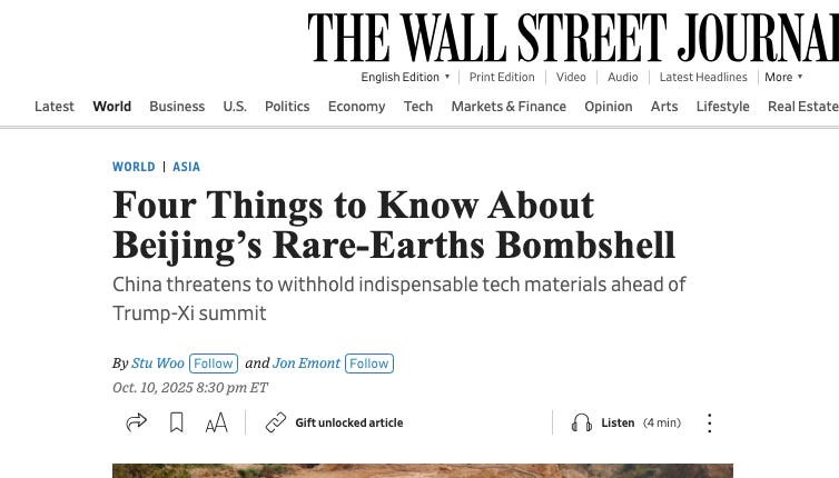 Trump has reacted by imposing tariffs, but there’s not that much leverage in using those at this point. There are other levers Trump could use, so this story isn’t over, by a long shot. No one knows whether China will follow-through; the stock market fell sharply on Friday, but it wasn’t the kind of actual crash you’d see if people really thought China would end the data center build-out. And it could all just be a hard-nosed negotiating posture, with a plan to relax it soon. (Though it is notable that the TikTok deal hasn’t gone through yet, so China could block that as well.) All that said, Chinese leverage over U.S. politics is remarkable to see. For a long time, the expression in China was “Hide your strength, bide your time.” No longer. And it’s not a result of Trump, though Trump’s tactics likely accelerated China’s new posture. I wrote about this strategy years ago.