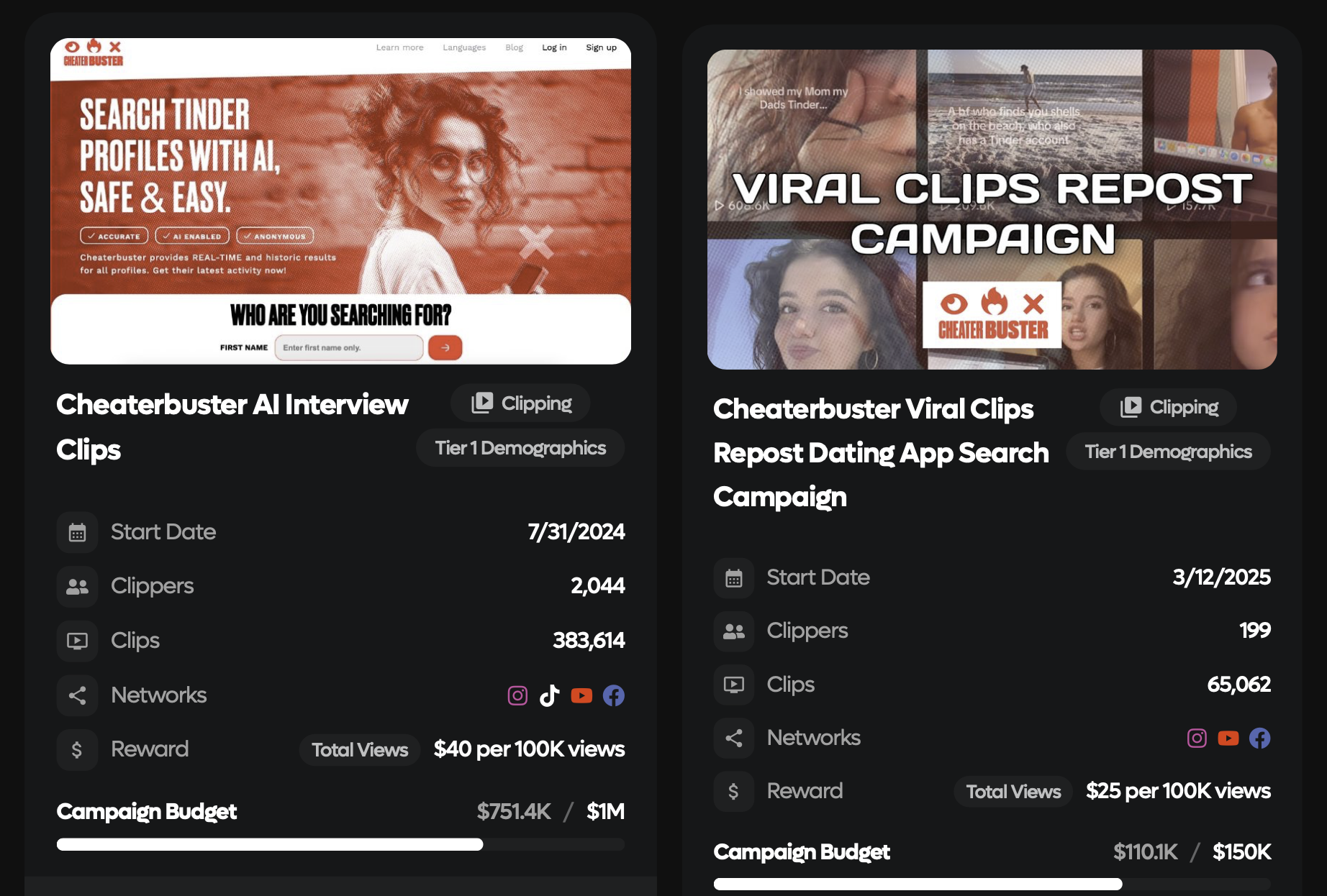 “I think that an app that allows you to find the dating app profile and general location of a person based on just one photo is an excellent tool for stalkers,” Eva Galperin, director of cybersecurity at the Electronic Frontier Foundation (EFF), told 404 Media. “A lot of this stuff that is framed as ‘tools to catch cheaters’ is perfect for abusers in the same way that ‘tools to catch thieves’ are perfect for stalkers.” One of the sites, called Cheaterbuster, has been around for years under another name, Swipe Buster. It more recently introduced facial recognition features. 404 Media tested the site on two people with their consent. In both cases, 404 Media uploaded a photo of the person for Cheaterbuster to perform a facial recognition match. For the first test, the correct person appeared as the top result. For the second, they appeared slightly deeper in the search results. Clicking on the results showed where that person had recently used Tinder. In the first case the result was accurate to a specific neighborhood in Los Angeles that the person visited. In the other, the result pointed to the particular part of Brooklyn that person lived in. Both locations were slightly outdated, but were still recent locations these people had visited. 💡 Do you know anything else about these sites? Have you used one, or do you operate one? I would love to hear from you. Using a non-work device, you can message me securely on Signal at joseph.404 or send me an email at joseph@404media.co. Cheaterbuster does require users to enter a target’s known or suspected first name, age, and city. But the results provide options in case the provided information is inaccurate. Users can select “face matches, different names” to see people who look like the photo they uploaded. The results also show a list of people with similar names and ages in case the information is slightly off. They can also turn on a “show everyone” feature which displays all results for the age range regardless of the name entered. The site’s FAQ says a target’s age “doesn't have to be accurate to the day, but please put age as accurate as you can. Do not put 22 for a person who is 35, but if you are not sure if the person is 23 or 24, don't worry—put whatever you think is closer.” For a location, the site suggests people put in an office, hotel, club, or friend’s house. “Anyone can use this service, it is open for everyone. All you need is an internet connection and a valid email address,” the FAQ adds. Cheaterbuster charges a monthly fee of around $20 a month. Another service 404 Media found is called CheatEye, which also says it uses facial recognition to surface specific peoples’ Tinder profiles.  A screenshot from CheaterBuster's website. The sites appear to rely on publicly available information from Tinder profiles, but that data cannot ordinarily be accessed through the normal Tinder app. A Tinder spokesperson told 404 Media: “We have no relationship with CheatEye or Cheatbuster. Not only do we not authorize this practice, it is squarely against our policies. We know that users trust us with their personal information to help them make meaningful connections. We do not take this lightly and intend to always keep that trust.” Cheaterbuster and CheatEye did not respond to requests for comment. Years ago a now infamous company called Clearview AI scraped social media and the web to build a massive database of peoples’ faces. It then sells a facial recognition tool to law enforcement agencies, including a recent $5 million contract with ICE. But facial recognition is far from only a government tool now. Sites like Pimeyes allow anyone to do much the same thing, by uploading a photo of someone and the site showing where else that person has appeared across the web. Students recently combined Pimeyes and other off-the-shelf people search tools with Meta Ray-Ban smartglasses to instantly dox strangers. Now, the same technology is being used by people to find specific Tinder users. Cheaterbuster has gained much more attention recently after TikTok and Instagram accounts posted a tsunami of videos promoting Cheaterbuster and its facial recognition capabilities. In one a man interviews a couple and appears to do a facial recognition search of the woman, revealing a Tinder profile in her name. In one brainrot video (where a second clip, in this case of a farming video game, also plays on the screen), a man talks to a couple and demos Cheaterbuster to them. They allegedly find the man’s profile in Tinder after performing a facial recognition search. Even prolific grifter Ian Miles Cheong has promoted the company.  A screenshot from Clipping.io “The facial recognition scanned through the data gaps. This just came up,” an interviewer says in one of the videos while the screen shows various blurred photos from what is presented as the man’s Tinder profile. It’s not clear if the people in these videos are genuine users because some are part of Cheaterbuster’s affiliate program, which pays content creators $9.99 for every paying subscriber they refer. The program is based on a referral platform called Clipping.io. Pierce Scholato, the CEO of Clipping.io and who appears in a Cheaterbuster video promoting the program, did not respond to a request for comment. Clipping.io offers to pay people through Venmo, Cashapp, or various cryptocurrencies. Creators log into a dashboard where Clipping.io provides ready made vertical video for them to edit and distribute as they see fit. In one tutorial video 404 Media viewed, Scholato said Cheaterbuster is paying $40 for every 100,000 views. “They are literally paying you more than YouTube and TikTok to post their clips,” Scholato says. The dashboard shows various Cheaterbuster focused campaigns and their alleged budget. One allegedly has a $1 million budget with more than $750,000 already spent. Another has a $150,000 budget with most of that alr