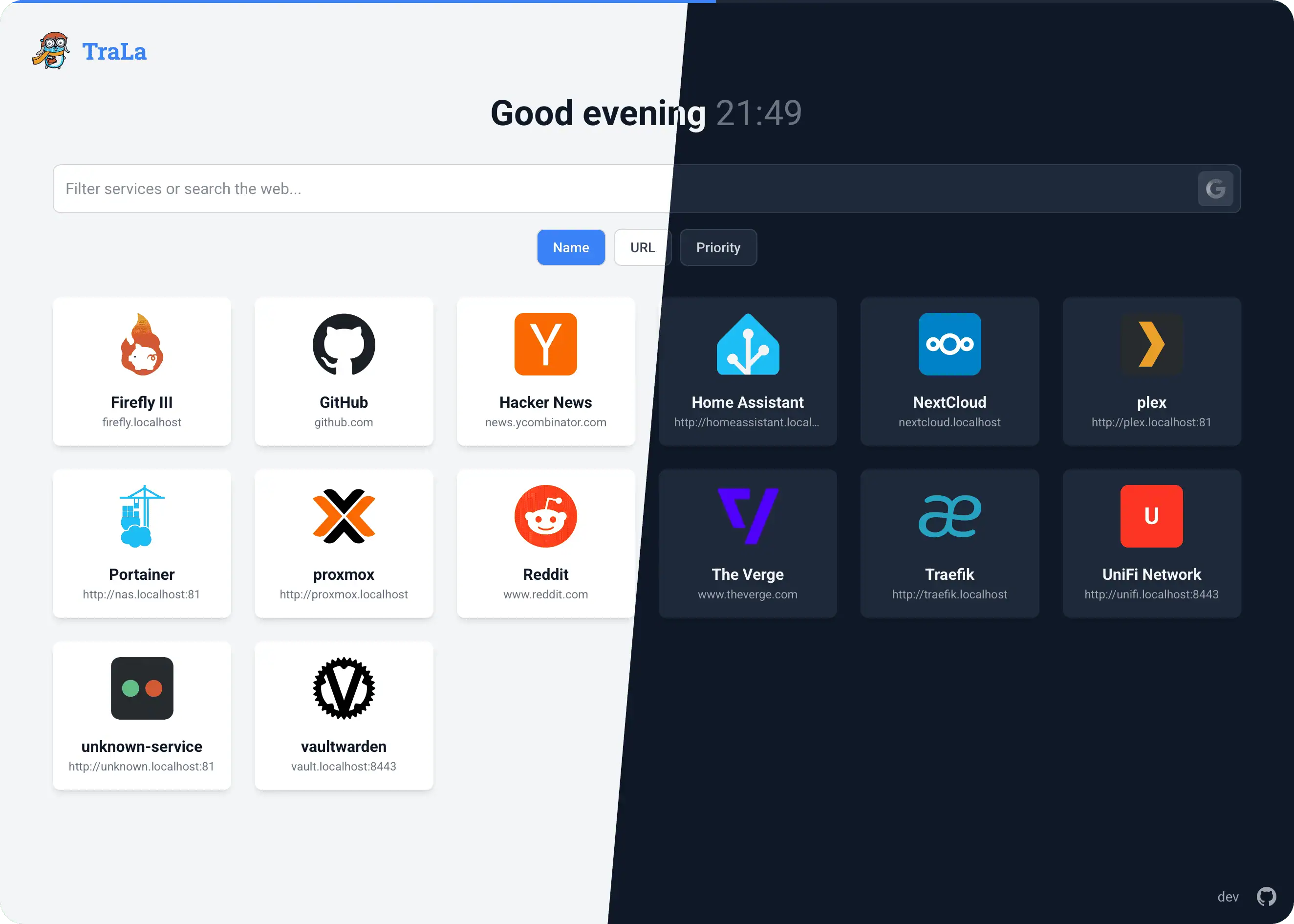 More from selfh.stContent SpotlightMeet TraLa, a modern, hands-off dashboard that auto-discovers and populates services using HTTP routers from Traefik. Features include advanced icon fetching via selfh.st/icons, custom icon support, live search and sort, external search bars, service exclusions, and more. TraLa can be easily deployed via Docker and requires an instance of Traefik for auto-population.