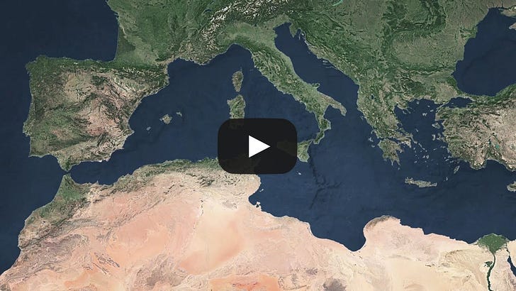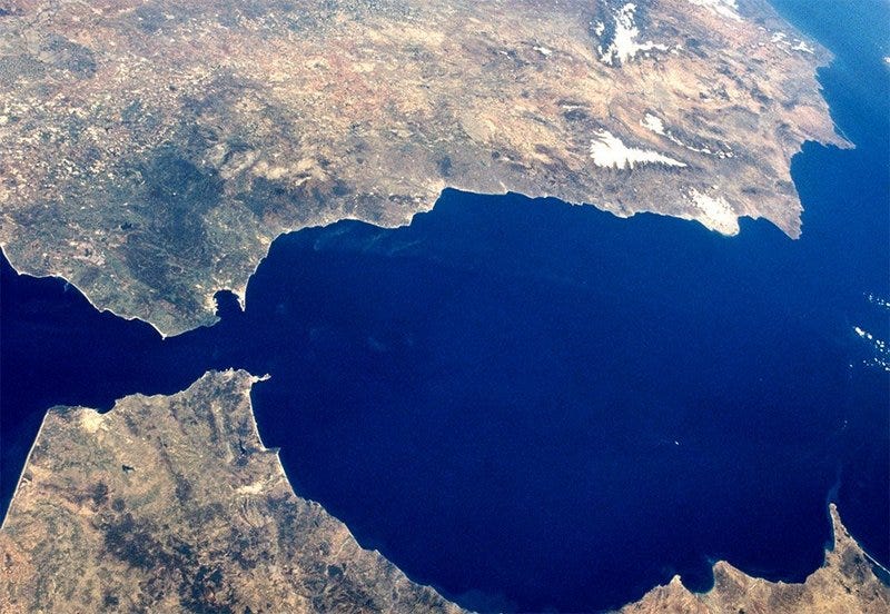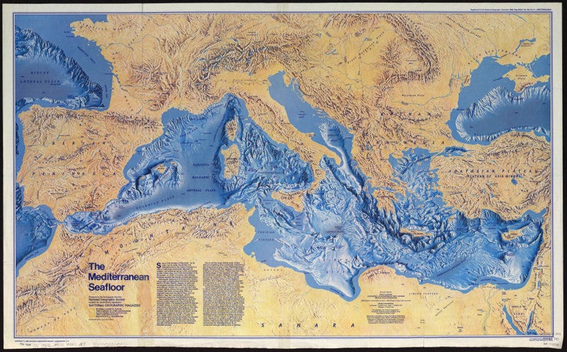 Hello! This is Everything Is Amazing, a newsletter about science, curiosity and why the fun is why. It’s currently on a break before the next season begins - so alas, you’re not getting anything brand new from me until late November. But if you do want to read everything I’ll be publishing for paid subscribers over the next 6 weeks, and follow along on my quest for a good night’s sleep according to the latest science, you can join them by clicking below: Today, though, we’re turning the clock back to a piece I first ran in early 2022, with a 2025 update on the story at the end. Here’s the real-life tale of an entire sea that came back to life in the most dramatic way imaginable. It’s 2016, and I’m on a ship, fulfilling one of my lifelong dreams. It’s all down to an article I read as a kid in one of my dad’s many copies of National Geographic - a romantic, stirring portrayal of Gibraltar, that last peaceful haven of ‘civilization’ before you set sail for the wilder thrills of Terrifyingly Foreign Lands. (Sigh. Well, I was only young.) But as I grew up, I learned more and more about Africa: about how unimaginably vast it was compared to everywhere I’d ever known, about its beauty and its ugliness, and its bewildering diversity of peoples and cultures and ideas and landscapes and ways of living and thinking and being… I also read travel writing about it (mainly from men who were non-Africans, still a huge issue) - and in most of what I read, Africa left that writer changed forever. I wanted that too. And to get the most amount of change on offer, I decided to arrive in Africa without cheating. It had to be by sea. No flying allowed. I would arrive in Africa after voyaging between the Pillars of Hercules, across one of the great seaways of the world. (Would it be perilous? Maybe! A bit would be nice. Isn’t that what adventurers deliberately seek out, just the right amount of peril? Tally-ho!) Looking back, a lot of this is troublesome: an entirely selfish dream about what Africa would give me. But still, on readying myself for this sea crossing in 2016, it felt like the right call. I felt it in Algeciras, looking across the sea to the mountains of Morocco, absurdly close across the Strait. I felt it on the ferry, as those mountains gained detail and my thoughts caught up with themselves (“woah, that’s AFRICA…”). And I even felt it in Tangier when my girlfriend and I were arguing with taxi-drivers fanatically intent on charging us 20 times the going rate, presumably because I had exactly the kind of facial expression of someone who should never, ever visit anywhere outside of the UK on his own. (There’s your peril, Mike. Enjoy!) In crossing the Strait of Gibraltar by sea, taking great lungfuls of sea air and snapping away madly with my crappy camera-phone, I thought I was having the best experience available - and inviting into my excitable brain the maximum amount of awe and wonder available to me. In fact, I was looking for them in entirely the wrong direction. Six million years ago, the Mediterranean Sea looked very different. For starters, “sea” is a misnomer. Because it appears there wasn’t one. In place of the 1,000,000 cubic miles of seawater that currently stretches 2,500 miles (4000 km) from Gibraltar to the Gulf of İskenderun (Turkey), there was… Something. It’s unclear what. But it wasn’t a “sea”. A big problem here is how unimaginably distant 6 million years is. Putting it at its simplest, that’s time for a lot of monumentally huge things to occur and then be completely erased by the most gradual of natural processes. (When I was an archaeologist, we always had to think about the story-muddying effects of taphonomy, the natural processes that break down & scatter biological material. It’s detective work that often gets brain-bendingly complicated - and that’s only across centuries or a couple of thousand years.) Over millions of years, rainfall can completely dissolve away rock, erosion can strip away vertical kilometres of soil and sediment - and the tectonic plates determining the shape of land & sea can buckle and heave into forms we wouldn’t recognise today. At a local scale, it’s enough time for anything to happen. For indicators of what actually did happen, we turn to geology. In the 1960s, a seismic survey (think “geological ultrasound”) of the floor of the Mediterranean uncovered a continuous feature a few hundred metres down. Further investigations by the crew of the research vessel Glomar Challenger in the ‘70s confirmed both its existence and composition. It was salt. Lots and lots of salt. More salt than you’re capable of believing, I’ll bet. Some of these layers of salt were two miles thick. As National Geographic science writer Maya Wei-Haas puts it: “enough to give each of the world’s 7.7 billion people nearly 50 Great Pyramids of Giza filled with the stuff.” (Read that again, if you like! It won’t help though. Sorry.) Salt comes from evaporated seawater - so, salt on this scale? It must have been the mother of all dessications. Scientists now refer to this as the Messinian Salinity Crisis, named after the geological age it took place in. In some presumed tectonic upheaval, the sea floor of what’s now the Strait of Gibraltar was thrust upwards, forming a bridge that cut the Mediterranean off from the Atlantic, its main replenishing source of water…and the Med started drying out. After some amount of time - certainly more than all recorded human history, probably even longer than the 300,000 years that anatomically modern humans have existed on Earth - the bowl of the Mediterranean was a deep, empty desert, save for a few huge, super-salty lakes of unknown size. (There’s fossil evidence that suggests the presence of marine life during this time, so the Med is unlikely to have completely dried out.) An enormous salty dryness, up to 900 miles across, with sloping cliffs over a mi