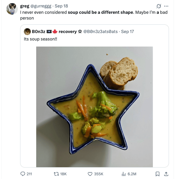 The whole “lifestyle guru for men” angle is now more or less window dressing for someone who described himself in the original viral video as an “internet entrepreneur”. He’s gone where the money is, and he seems to understand that he hit it big thanks to his sense of physical comedy and absurdity. Each of his videos makes sure to include some strange quirk like a cooldown avocado or a bunny companion. | | A Good Soup Post | | | | Some Stray Links | | | P.S. here’s everything but beeves feathery. | ***Any typos in this email are on purpose actually*** |