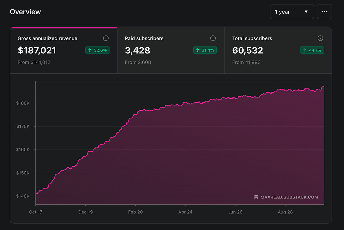 This is the kind of thing, for better or worth, your subscriptions are supporting! In some sense, the political, technological, cultural and psychosexual developments of the past 12 months have been exactly what Read Max was built to cover. The convergence of an increasingly reactionary software-industry executive class and an influencer-led Republican party at the helm of the U.S. government, their alliance buoyed by a mystical A.I. bubble and legitimized by a flood of slop, backgrounded by mounting nihilistic violence and a debased and decaying aesthetic culture, feels a bit like like this newsletter’s version of GameMasterAnthony’s birthday: The gang’s all here! And I have been very pleased to try to synthesize some of these developments in posts like the above and others that didn’t quite make the cut, like “The A.I. backlash backlash,” “What Type of Guy was the alleged Charlie Kirk shooter?,” and “Admin is crashing out.” I hope that those posts (and others) have helped readers make sense of the world, and I feel quite proud of most of this work. But, speaking as the guy writing all this, it’s been rough going. It’s not so much that the news is so consistently depressing (though it is) as that it’s become so consistently dull. The “convergence” between all the many spheres of Read Max coverage--tech, politics, culture, media, etc.--has turned so much of what interests me into undifferentiated aspects of a single, awful omni-story. The early days of both the A.I. bubble and the second Trump administration had, at least, the frisson of novelty--new conjunctures to explore! Now, both grind on together toward what feels like a cruel and inevitable collapse, absorbing all light and oxygen, shrilly demanding full attention even as their capacity to surprise disappears entirely. I don’t want to invoke “burnout” here so much as boredom, or maybe both at once; this newsletter is at its most fun when the things I’m writing about truly interest or challenge me, and it’s increasingly hard to force any kind of real interest in (or feel any kind of real challenge from) in “A.I.” or “Trump.” The good news is that there is, for now, plenty of other stuff to write about. Among my favorite posts this year are those about “Stomp Clap Hey!,” the Nissan Sentra in One Battle After Another, and shock streamers on Kick--none of which were wildly successful, as these things go, but to which readers responded warmly and which didn’t make me want to die. But the reality is that the news environment is oppressive, and I think reader exhaustion is showing up a little bit in my growth figures. GrowthIt’s been a somewhat strange year for growth. Since I started Read Max I’ve enjoyed relatively consistent linear growth on Substack on a year-over-year basis, and this past year has largely passed in line with expectations: 809 new paid subscribers (compared to 850 for the prior year); 18,500 new total subscribers (compared to 13,000 for the prior year); and a roughly $45,000 bump in revenue (identical to the prior year). But the precise nature of the growth has been notable: Read Max grew twice as fast as usual from October through February (netting around 600 new paid subscribers) only to then enter a long flat period of very slow growth (roughly 200 new paid subscribers over the past eight months): My longstanding belief, elaborated many times in these yearly reports, is that “year over year” is the only proper way to judge the growth of a digital-media business, and that spending time obsessing over month-to-month volatility is a good way to drive yourself crazy, become obsessed with “the algorithm,” start whispering conspiratorially about “shadow bans,” and generally act in the undignified and unbecoming manner of a professional X.com poster. Throughout my time on Substack I’ve seen growth accelerate and taper off for occult and unknowable reasons, and as long as the numbers look good compared to last year there’s no reason to panic. But this is the longest plateau I’ve experienced on the platform, and the deceleration is stark and unavoidable. Even if it’s not time to panic, it’s worth confronting. So what’s caused the growth rate to change to dramatically? I think there are contributing extrinsic factors: Substack the platform seems to have experienced a kind of “Trump bump” that probably disproportionately favored those of us well-positioned to write about the role of Elon Musk in the administration’s shocking early days; people may be feeling newsletter or news fatigue or canceling subscriptions because of the effects of Trump’s trade regime or in anticipation of a recession; summer is almost always a slow period. But a shift as direct and immediate as the one visible on the chart above suggests to me something specific changed toward the end of February about how I grow on Substack, most likely in the platform’s recommendations algorithm that drives quite a bit of my growth. This is the danger of working on a platform. While I am lucky enough to own a direct relationship to my subscribers (unlike many other content creators), and could download my email list and walk away from Substack at any time, I (like most Substackers) have become reliant on the company to take care of a lot of the “dirty work” of subscription-newsletter promotion. I earn new subscribers through platform features and network effects simply from being on Substack itself, without needing to do any of the various kinds of self-promotion and marketing that people from my micro-generation find distasteful and debasing, and that are also “a lot of extra work.” (Growing steadily and absolutely has also allowed me to keep Read Max’s prices steady for its entire existence, rather than trying to squeeze more blood from the poor suckers who subscribe to this dreck in the first place.) Because I’ve grown at rates much higher than 10 percent every