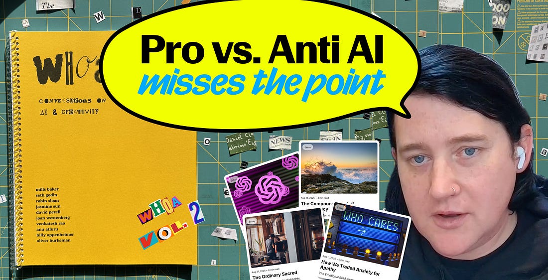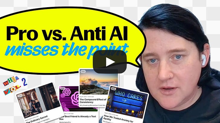 I don't care if a robot wrote it. If it's good, it's good.Joan Westenberg is someone you need to know.This is the Sublime newsletter, where we share an eclectic assortment of ideas curated in and around the Sublime universe. In case you missed it… we released our annual zine: Whoa, Vol. 2: Conversations on AI and Creativity. We’ll be releasing one conversation here each week. If you’d rather savor instead of scroll + want early access to all ten conversations, including Oliver Burkeman, Venkatesh Rao, and Anu Atluru, grab the physical + digital zine. And if you already ordered your copy, the next batch will be shipped this weekend. This series is made possible by Mercury: business banking that more than 200k entrepreneurs use and hands down my favorite tool for running Sublime.Running a company is hard. Mercury is one of the rare tools that makes it feel just a little bit easier.A conversation with Joan WestenbergThis was my favorite conversation in the entire series. I agree with Joan’s takes on basically everything. I also like the way she expresses things — it has a very calming effect on my nervous system. I first heard of Joan Westenberg when her article I deleted my second brain went viral. She then posted on LinkedIn that sublime is the only knowledge tool she enjoys and now I love LinkedIn and I love Joan. Here is the link to subscribe to her work. In this conversation, we cover…