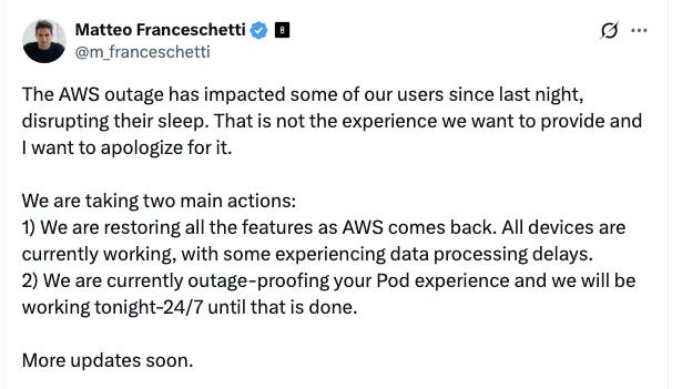 Amazon Web Services Had a Very Bad Day, Amazon's Stock Price Did NotThe outage of Amazon Web Services caused hundreds of billions of damage, yet Amazon's stock went up. How do we account for all of that cost?Yesterday, Amazon Web Services, the cloud services backbone of the internet, had a serious glitch that took down a large chunk of the internet. How much did this outage cost? That’s not clear. But it was certainly a big number, with some estimates in the hundreds of billions of dollars. Many people experienced the AWS outage in terms of time wasted, Zoom meetings not working, random services breaking, or apps hanging up or not launching. I had trouble dealing with Verizon, their customer service team took 15 minutes to respond to a chat query, and explained they were having “technical issues” on their end. The outage affected everyone from Netflix to Snapchat to Venmo to thousands of other vital products and services. Here’s the CEO of Eight Sleep, which makes internet-connected beds, apologizing for the outage and its affect on the sleep of its customers. Leaving aside why beds need to be connected to the internet, let’s just stipulate that some sleep got messed up. And all of these costs were incurred because of dysfunction at AWS. We don’t have a name for the externalities induced by the market power here. In 2022, Cory Doctorow described the cycle of decay of tech platforms, where they lock you in and then decrease overall quality. He deemed it “enshittification.” I think it’s worth offering a cousin to this term, which I’ll call “Corporate Sludge.” Corporate sludge is the cost, or costs, of an excessively monopolized and financialized economy, that do not show up on a balance sheet. Here’s what I mean. According to Amazon’s internal financials, AWS has a high profit margin. In 2024 it had $107 billion in revenue, and generated $39.8 billion in profit, with is a 37% operating income. A normal product or service, when faced with a catastrophe like the AWS outage, would take a financial hit. Yet here’s the stock of Amazon yesterday. In other words, the costs of the AWS outage did not show up on the balance sheet directly responsible for it, or in the equity markets supposedly measuring long-term expectations of corporate profits. Economists would call the wasted time a “negative externality,” it’s the equivalent of pollution. And while that cost doesn’t show up anywhere we can affirmatively identify, someone has to pay for it. Those missed meetings, that lost production, it raises costs for virtually everyone, a little. This cost is what economists or government statisticians just don’t see, because it isn’t measured. But that doesn’t mean it’s not real. Once you start looking, you start realizing that corporate sludge is everywhere. I did an interview with corporate procurement specialist Rich Ham, and he told me that big corporations laid off most of their procurement teams as a cost-cutting measure during the financial crisis. Since Wall Street penalizes CEOs for hiring people, and rewards them for firing, they won’t spend to rebuild those teams. As a result, suppliers of things like uniforms, waste disposal, guards, and pest control massively gouge the corporate world. According to Ham, corporate procurement costs are going up 7% a year. And those increased costs, that corporate sludge, is passed along as higher prices, even as accounting profits aren’t improving. Executives think they are being efficient - headcount is down - but then they wonder why everything costs so much. I suspect, though it goes unmeasured, that a lot of the increase in inflation that no one can quite explain is a result of corporate sludge. It’s a bit like ‘dark matter,’ a fudge factor astronomers created to describe why their theories of the properties of matter can’t explain the expansion of the universe. Similarly, I don’t believe economists have a good explanation for inflationary increases of the last few years. They certainly understand that supply chains broke, but they can’t describe why prices didn’t go back down once they were repaired. And I don’t think anyone can really explain why the economy seems to be booming, while ordinary people are unhappy. My fudge factor to explain it is corporate sludge - there’s massive inefficiency everywhere as a result of hidden market power that doesn’t show up on balance sheets, but shows up as time wasted, anxiety, and extra costs where you don’t expect it. Health Care SludgeI’ve been thinking about the concept of corporate sludge for about a year, after the debate over health insurance in the U.S. prompted by Luigi Mangione’s alleged killing of a health care CEO. At the time, there was a lot of back-and-forth about popular anger at insurers. Economic commentator Noah Smith wrote a piece that bothered me a lot, explaining why we were focused on the wrong bad guy. Here’s the headline: He explained that American anger is misplaced. Insurance companies, he wrote, are generally efficient pass-throughs that got the blame for covering for greedy doctors. What was Smith’s evidence? Well, it was a balance sheet analysis. While UnitedHealth Group’s revenue is on the order of $400 billion, he explained, the company had a thin profit margin of just 6.11%. It’s actually efficiently run, not greedy. What kind of a villain or monopolist passes most of its revenue on to someone else? It’s a rational argument from Smith, and yet, not persuasive. People hate United Health Group, because we know that analyzing accounting profits excludes the real costs of its behavior. The experience of health care is full of corporate sludge, from having to dispute weird bills to being steered to medication that may or may not be correct, to doctors spending their time fighting with bureaucrats over reimbursements and audits. In February 2024, UnitedHealth Group’s Change subsidiary got hacked, and it shu