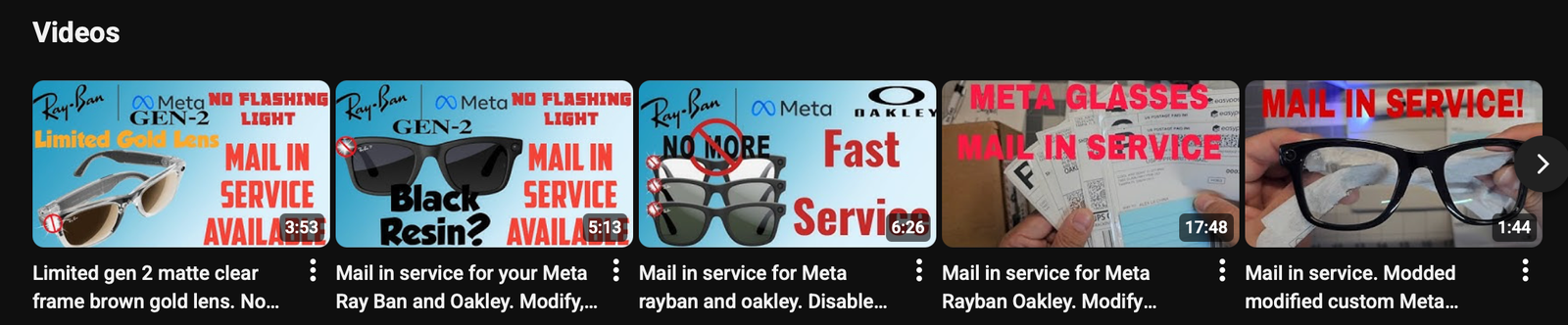 404 Media purchased a pair of Kim’s modified glasses for verification purposes. The hobbyist charges $60 for the tweaks, or the full price of the glasses plus the modification fee if a user doesn’t own a pair. The description of Kim in his workshop comes from videos he seemingly recorded with our glasses while modifying them. Kim’s work, for what it’s worth, is quite high quality. The only indication that the glasses had been modified at all was the fact that the seal on the box it came in was broken. But otherwise, the padding on the glasses’ arms were on, as was a plastic pull tab on the nose piece that the user is required to remove before testing it. The setup was the same as with unmodified glasses: 404 Media had to download the Meta AI app, connect it to an account, and login. The welcome tour, which consisted of a tutorial about how to take photos and videos with the glasses, noted that “the LED shows others when you’re taking photos, recording videos, or streaming.” Another welcome screen said: “Get ready to capture! Respect people’s privacy,” and “Let that LED shine. The capture LED shows others when you’re taking photos, recording videos, or streaming so you won’t surprise them.” It recommends asking “Is it okay to capture here?” or “Are people around you aware?”. “If you’re unsure, just ask,” the screen says. Of course, on these modded glasses, the LED light did not turn on at all when taking photos or recording videos. 💡 Do you know anything else about how people are using Meta Ray-Bans? Do you work at Meta? We would love to hear from you. Using a non-work device, you can message Joseph securely on Signal at joseph.404 or Jason at jason.404 404 Media repeatedly tested the glasses to see if the LED turned on. In our tests, the front-facing recording LED did not illuminate while we were recording or taking pictures. A small light on the inside of the right arm of the glasses did illuminate, but was perceptible only very close to the glasses, in dark lighting, and to the person wearing the glasses. For years Meta Ray-Ban users have been searching for ways to film others without them knowing. Reasons on various Reddit threads range from an attorney wanting to record signatures; filming concerts; or the light distracting their baby when trying to film them. Another Redditor asked “My horny friends interested in spying on girls that are out of his league.. what’s the best way to hide the flash when he’s horny and wants to start recording?” Many of the Meta Ray-Ban users post disingenuous comments such as “thousands of people use phone camera without any permission,” ignoring the fact that it is very obvious when someone is filming with their phone, given they are typically holding the device up. In a Meta whitepaper, the company says “The LED signals when it matters most: Bystanders can trust that when they see the LED is on, users are actively capturing photos or videos for later.” Screenshots from videos included on the glasses. Those Reddit threads also show users experimenting with different methods for blocking or disabling the LED while still being able to record, including covering the camera with your hand for a second before filming, or puncturing the LED. Other people have taken Meta’s Ray-Bans and combined them with off-the-shelf technology to instantly dox strangers. Last year 404 Media reported that two Harvard students, AnhPhu Nguyen and Caine Ardayfio, married the glasses with a facial recognition service and people search sites to pull up information about people they looked at, including their home address, phone number, and family members. The pair tried the tech on real, unsuspecting people in public. For his approach, Kim said he was “in essence, just disabling LED with drill.” A Meta spokesperson told 404 Media in an email “trying to intentionally cover the LED capture light, disable it or otherwise tamper with the glasses” is a violation of Meta’s terms of service. “The Capture LED is there for a reason,” the spokesperson continued. “It lets others know when you use your glasses to take photos and record videos for your gallery or streaming. If the LED is covered, you’ll be notified to clear it. We’ve made tangible improvements to bystander privacy with a larger and more noticeable LED and innovations such as tamper detection when we launched Ray-Ban Meta glasses.” The spokesperson said that Meta has increased the size of the LED from 1mm to 2mm, and changed the blinking light to a solid one following feedback. Screenshots from Kim's YouTube channel. “In order for people to feel comfortable using AI glasses in everyday life with family and friends, they have to feel in control of their privacy when wearing them. We’ve baked privacy directly into the product design and functionality of our AI glasses collection to give both device owners and people around them peace of mind,” the spokesperson added. “We also built in tamper detection that disables capture if the LED is covered when a user is actively capturing photos or videos,” they said. Clearly, those did not stop Kim. Kim advertises his Meta Ray-Bans modification service on YouTube. In videos he demonstrates that the light no longer shines, thanks his growing customer base, and shows some of the eBay reviews he says he’s received. Some of those include: “Glasses were in very great condition,” “seller was honest and quick,” and “a pleasure to do business with.” eBay has already removed many of his listings. A review of Kim’s Venmo profile shows multiple people paying him for “Meta glasses service” and similar. Unusually, Kim sometimes reads out his customers’ names during his YouTube videos and shows part of their shipping label. “This is Suzanne’s order,” he says, for example. A tipster who originally alerted 404 Media to Kim’s service said that the video also showed shipping barcod