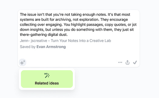 ChatGPT can’t be everything. There will be lots of space for curated, creative spaces for people to use.Then once customers are in, it’ll be difficult for them to churn because the file architecture is so different from other note tools. By owning the taste graph (curated cards + notes + collections) Sublime compounds and powers better related results which is hard for other tools to replace. The simple promiseMost note tools are filing cabinets. Sublime is a studio. Save a line and it answers with adjacent sparks; pull your references together into a collection, and with a single click, Sublime pipes your own references into ChatGPT or Claude so you can start creating from your own ideas. If you’re curious, try Sublime. In personal experience, saving an excerpt from an article I wrote and discovering a line from Julia Cameron’s The Artist’s Way was indeed, a sublime experience.