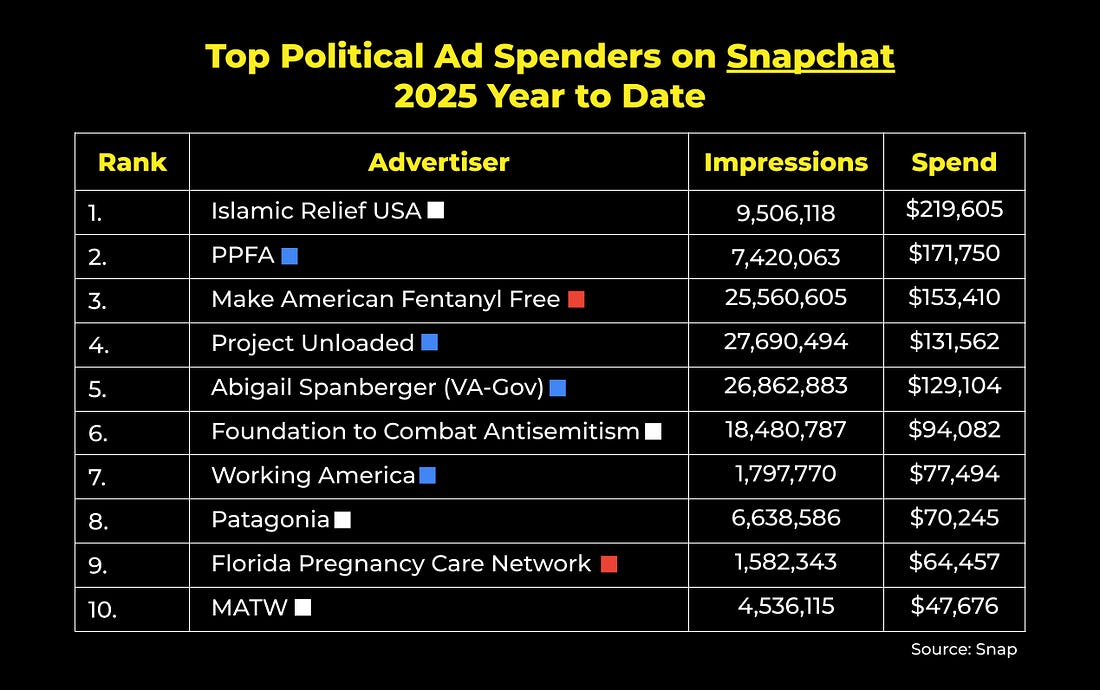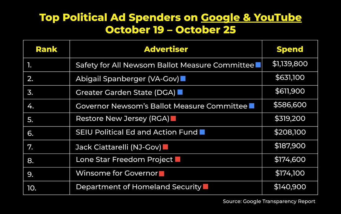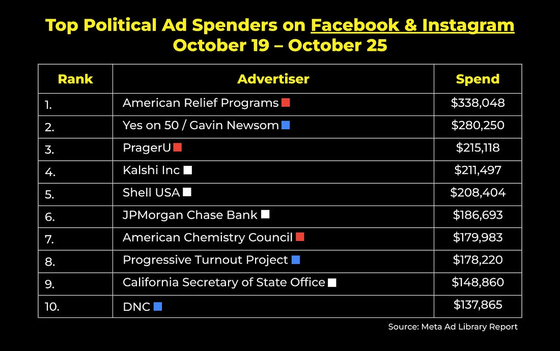 Mikie vs MAGA: Everything You Need To Know About Tuesday’s Closest RaceAlso inside: Adelita Grijalva stumps for the DNC, pleas for gun-control blanket Snapchat, and five horror picks to end spooky season right.Hello everyone, I’m back. 🤖For those who don’t remember me, I’m Scott - a campaign strategist, content expert, and horror movie superfan (and former horror filmmaker) who’s written FWIWs about the Rockbridge Network, the coming AI election, and the “conservative Cosmo.” It’s Halloween, and while most people are thinking about costumes and candy, political nerds like me are focused on next week’s election. New Jersey’s governor’s race is shaping up to be one of the most interesting contests of the year, and perhaps, a preview of 2026?? Get ready to dive in. Plus, for horror fans or anyone who’s horror-curious, I lay out five of my top recommendations for a weekend watch. More on everything below, but first… Digital ad spending, by the numbers:FWIW, U.S. political advertisers spent about $15.2 million on Facebook and Instagram ads last week. Here were the top ten spenders nationwide: With Election Day around the corner, Gavin Newsom has been all in on passing Prop 50. Last week, the administration ran informational ads letting people know there is an election, and Newsom’s Yes on 50 initiative ran persuasion ads featuring Pres. Obama, Rep. Ocasio-Cortez, and other prominent Democrats. Also last week, the DNC cracked the top 10 list with ads featuring still-not-sworn-in Representative Adelita Grijalva asking “What if I told you that a donation to the DNC could help force Congress to release the Epstein files?” Finally, during this period, the Sherrill campaign spent $22,750 while the Ciattarelli campaign spent $1,439. Very low amounts considering how much they spent on Google. Meanwhile, political advertisers spent just over $9.4 million on Google and YouTube ads last week. These were the top ten spenders nationwide: When comparing spending by state on Google & Youtube, it was: 1 - California, $2.38 million 2 - New Jersey, $2.15 million 3 - Virginia, $1.92 million 4 - New York, $536,000 This maps on pretty well to the top 10 spenders of the week. During this period, the Sherrill campaign spent $132,000 just narrowly missing the top 10. About 90% of SEIU’s spending was in New Jersey and Virginia. The notable exception is John Cornyn’s “Lone Star Freedom Project”, which is running ads like this one tying Trump & Cornyn together. On X (formerly Twitter), political advertisers in the U.S. have spent around $9.3 million on ads in 2025. According to X’s political ad disclosure, here are the top spenders year to date: …and lastly, on Snapchat, political advertisers in the U.S. have spent around $2 million on ads in 2025. Here are the top spenders year to date: Project Unloaded caught my eye this week. It’s a common-sense gun reform organization running ads (like this & this) pushing people to YouSnug.com. Once there, they learn about how gun violence is a leading cause of death for kids and that violence is more common in homes that keep guns. Mikie vs MAGAThe leaves are changing. Kids are getting ready to trick-or-treat. And somehow, it’s time for another election. Despite being an “off-year,” Tuesday will feature a number of prominent races. One of the most competitive is New Jersey’s governor’s race between Democrat Mikie Sherrill and Republican Jack Ciattarelli. Let’s examine the key dynamics and how they speak to our larger political moment. First, the candidates: Congresswoman Mikie Sherrill won her seat in 2018 by flipping a swing district. A Navy veteran and former prosecutor, she won this year’s gubernatorial primary with 34% of the vote in a six-way race. She’s considered a moderate and has a profile that the Democratic party has been eager to support. Jack Ciattarelli is a businessman turned state assemblyman. This is his third time running for governor, second time as the Republican nominee, and first time with an endorsement from Donald Trump. In 2021, he came within 3 points of defeating incumbent Gov. Phil Murphy, which was a real shocker considering that polls had Murphy up by 11 points right before the election. As of Thursday 10/30, Real Clear Politics shows Sherrill with a +3.6% polling average lead. The race tightened around the end of September, and some polls put this race in a dead heat. For context, between 2020 and 2024, Trump improved his loss margin in New Jersey from -16% to -6%. Meanwhile, Polymarket gives Sherrill an 86% chance of winning, and as it turns out, research shows that Polymarket is surprisingly accurate at predicting world events (i.e. 90% accurate one month out and 94% four hours before.) So what’s going on? If we take a historical view, both sides have something to be optimistic about. In Sherrill’s favor, Jersey voters typically elect a governor from the opposite party of the previous year’s presidential winner. In Ciattarelli’s favor, no party has held the Jersey governor’s mansion for three terms in a row since 1961. With historical precedent split, which voting blocs will decide the race? Traditionally, off-year elections come down to turnout. For Ciattarelli, that means replicating Trump’s overperformance with working-class voters, especially Latino men. For Sherrill, it’s about winning back some working-class voters and reassembling her 2018 suburban coalition of college-educated moderates and women. Polling shows that Ciattarelli’s voters are reportedly more enthusiastic, but registered Democrats still outnumber registered Republicans by over 850,000. So what are the candidates focusing on? First, you can’t talk politics in 2025 without talking about Trump. He endorsed Ciattarelli in May, and they held a telephone town hall together last Friday (10/24). Sherrill and her PACs have leaned into this support highlighting in ads that Ciattarelli is “100% MAGA.”