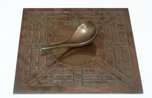 The first mention of a compass in the Muslim world? Around 50 years later. And Asia? Yep, China had them too - except around a thousand years earlier. Specifically, during the Han Dynasty period (206 BC - 220 AD). Have you ever seen a Han Dynasty compass? They’re…memorable. That’s right: the ancient Chinese navigated with spoons. Except, not really. These weren’t navigation tools, although they used exactly the same operating principles as modern compasses. Instead, this was about divination, the quest for the most feng shui way of arranging your surroundings - and therefore your life - for optimal harmony. (It seems they also had a secondary use by jade hunters to stop them getting lost - so even this far back, they were already being used to navigate in the modern way.) The name of these Han Dynasty compasses is the next twist in our tale. It translates as “The South-Pointing Spoon.” To them, the “top” of a compass (the neck of the spoon) pointed towards what we know as the South magnetic pole. After all, a compass just aligns itself with the Earth’s magnetic field. It’s humans who decide which way it’s pointing. If South-Pointing Spoons were the determining factor in orientation, a thousand years of Chinese maps might have had the south at the top. Instead, Chinese cartographers pointed maps the other way, like we do. Here’s why: