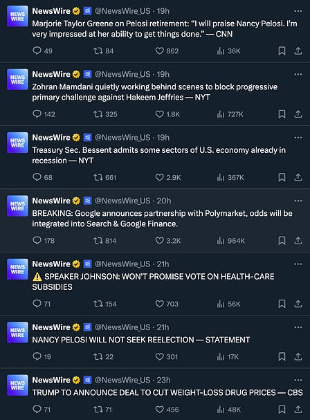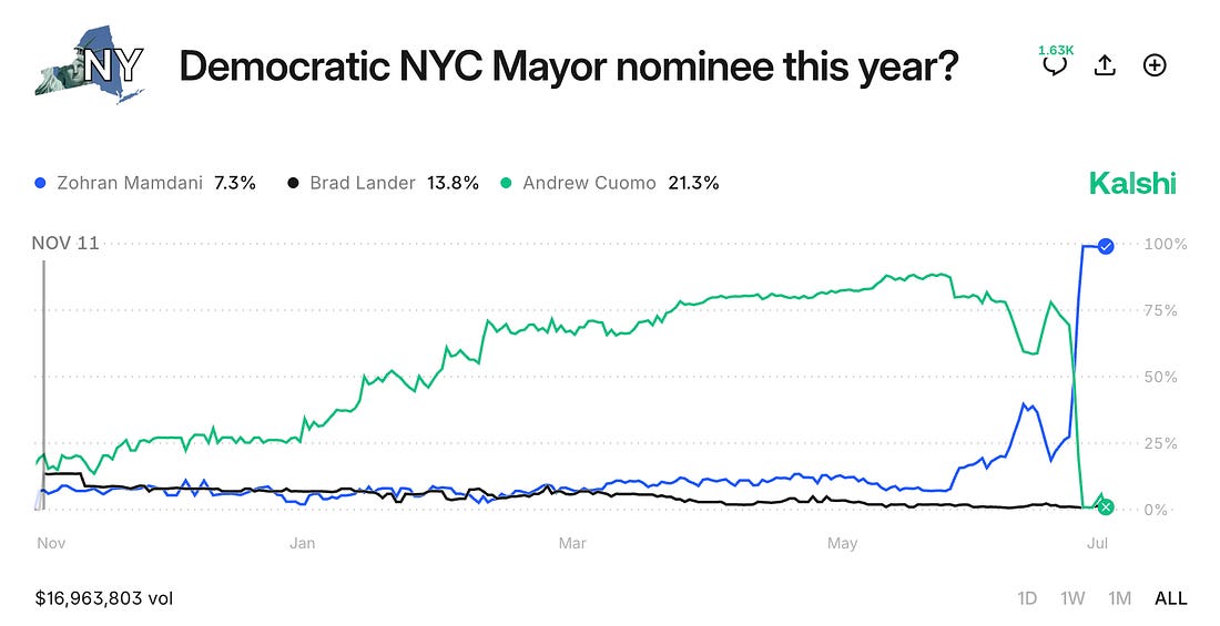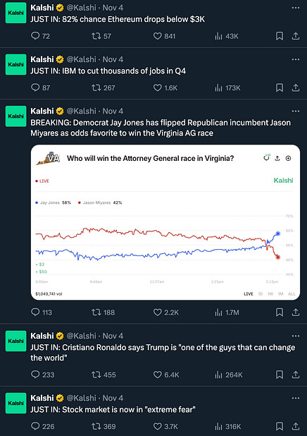 You’re reading Read Max, a twice-weekly newsletter that tries to explain the future to normal people. Read Max is supported entirely by paying subscribers. If you like it, find it useful, and want to support its mission, please upgrade to a paid subscription! Greetings from Read Max HQ! In today’s edition, some thoughts on predictions markets and suckerfication crisis facing American men. As every week, a brief reminder that this newsletter is funded by paying subscribers, whose support and generosity allows me to keep at least one newsletter every week open to all readers. If you’ve been enjoying the weekly column as a free rider, please consider returning the favor that paying subscribers are implicitly doing for you by upgrading to paid: For about the price of one beer a month, you’ll ensure that I can continue to entertain you, inform you, bore you, weird you out, etc. Among the funnier subplots in the run-up to this week’s elections has been the social-media marketing campaigns of popular predictions markets like PolyMarket and Kalshi, which have been tweeting insanely misleading slop touts like so: ![]() If you haven’t encountered them before, predictions markets are effectively non-sports sportsbooks where you can place wagers on the outcome of events like elections, but they’re structured much more explicitly like financial markets, where your wager is treated as a futures contract that can be sold rather than as a “bet” that you’re “cashing out.” Around this time last year, e.g., you could have “bought” for about 20 cents a futures contract guaranteeing a payout of $1 if Andrew Cuomo won the N.Y.C. Democratic Primary--a more sophisticated way of saying “bet on Cuomo to win at +400 odds.” You could have then “sold” those contracts around Cuomo’s peak in late May for around 90 cents--i.e., cashed out your wager at -900 odds--and made a tidy profit. Or, you could have held on to the bitter end, hoping to quadruple your money, and lost it all. There’s a lot of academic economic literature around predictions markets, which are particularly beloved for converting “the wisdom of the crowd” into implied odds. (At least, when the markets are large and liquid.) If a “Cuomo to win the N.Y.C. Democratic Primary” contract is selling for 90 cents--suggesting a low-risk bet without much upside--that means that most people expect him to win. (More specifically you might say that if the wager is trading at that price, conventional wisdom is assigning a 90 percent probability to Cuomo victory.) But if you thought, at the time, that Zohran Mamdani was likely to win--or, even, if you thought he was more likely to win than the “implied odds” were suggesting at that moment--you could buy contracts at about 7 cents, expecting the price to rise, thereby putting “skin in the game,” and, depending on the size of your wager, updating the odds to reflect your new estimation of the election. And, without even needing to risk your own money, you can use predictions markets as a rough measurement of “conventional wisdom,” for at least certain, potentially narrow values of “conventionality.” But the main thing to understand here is that these are sites where you bet on the outcome of elections (and, really, anything else), and because they are venues for gambling and speculation, they are heavily populated by young men with right-wing politics. I know this not because the markets over-rate conservative political outcomes (I’m not sure they do, in aggregate), nor because the comment sections on Kalshi are filled with boorish young reactionaries (though they absolutely are), but because “epistemically captured right-wing hobbyist gamblers and speculators” (which is to say, the average X.com user) is precisely who the markets have been targeting the past week, and for many weeks before that, on Twitter. Here is just a small flavor of the Kalshi account: If you still spend time on X.com, you will recognize here precisely the same clipped, decontextualized, link-free, moronically breathless style of tweeting deployed by “financial news for low-trust illiterates” accounts like Unusual Whales or ZeroHedge (or, for that matter, in a slightly different arena, PopCrave). Polymarket even runs one of these accounts itself--an entirely separate, barely branded “News Wire” account consisting of extremely dubious headline summaries of news articles: The main difference is that where Unusual Whales and its peers tweet wish-fulfillment and fear-mongering engagement-bait in exchange for payouts from X.com, Kalshi and Polymarket intersperse their “BREAKING: Trump Might Win Nobel Prize” posts with enticements to bet on the strange and volatile world depicted in the other tweets. The first-order goal of, say, posting an A.I. image of Zohran Mamdani crying with the text “BREAKING: Mamdani’s odds collapse in the NYC Mayoral Election” is not to pollute the information environment with fake news and propaganda; it’s to entice X.com users whose brains have already been fully liquified by news slop to put their dumb money where their dumb mouth is. Which is not so say that there are no corrosive second-order effects to this kind of marketing. Nor, for that matter, that the marketing would be acceptable were its only purpose to mislead a bunch of dupes. One way of thinking about Twitter, especially in the Elon Musk era, is as the latest and most sophisticated version of the mailing lists that have powered the conservative movement, and the various scams and cons and schemes that constitute it, since the 1960s--in other words, as a huge and immediately accessible collection of suckers, waiting to have their avidity and paranoia exploited for cash. The predictions markets here are happy to play the same role with heavy X.com users as crypto scams and meme-stock hustlers did on the same site a few years ago, or as cash-for-gold ads did with Fox News vi