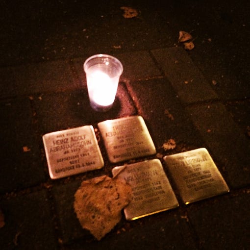 Today is November 9, which is the fateful date for Germany. In 1918 the first German republic was declared on November 9 and in 1989 the border between East and West Germany opened, paving the way to reunification. Still, we cannot celebrate this day, because the atrocities of the Shoa, this singular, most awful event in human history, overshadow everything and the November 9 pogroms in 1938 were the point were the violence against jews in Germany sharply increased. So on this Sunday while we are happy about reunification, we will remember what happened in 1938 and stand together vowing to never let this happen again. Every year on November 9, people everywhere clean the stepping stones in their streets that help us remembering the people who lived in our streets until they got deported. Many candles are being lit and people lay down flowers. It’s sad and beautiful. November 9 is a tough day.