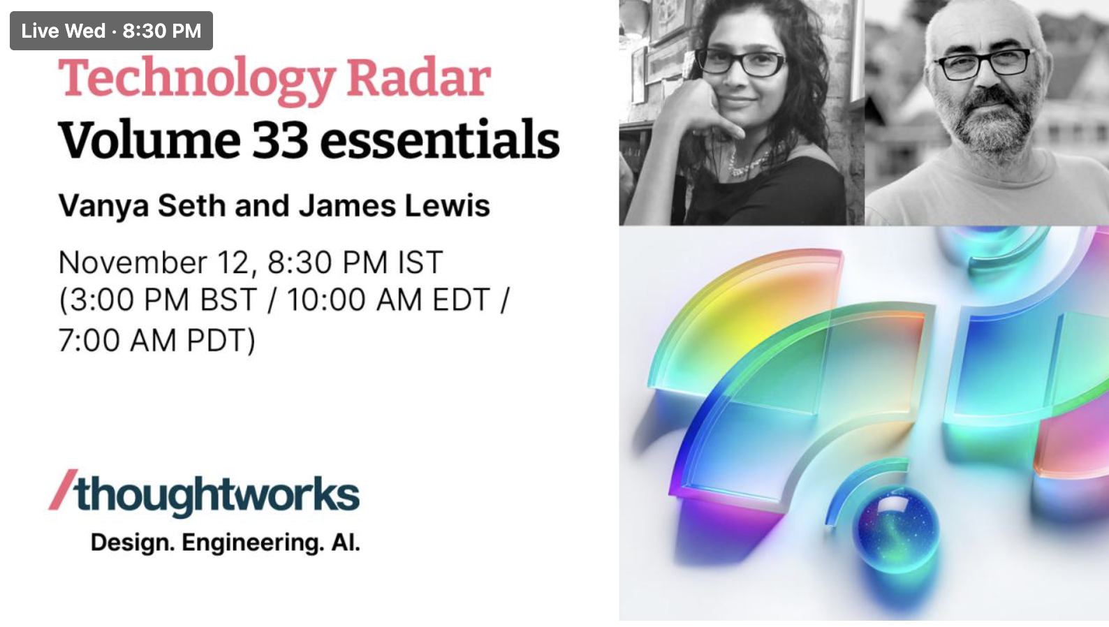 Featuring Distinguished Engineer James Lewis and Thoughtworks India’s Head of Technology Vanya Seth, this is a unique opportunity to unpack the edition following its publication and to ask questions to the people involved in its creation.