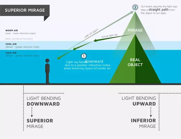 As he watched, the city shimmered and became a garden. And then a forest. And finally a landscape of vast armies, locked in combat over the ruins of buildings - before the whole thing disappeared completely. As Marina Warner writes in her book Phantasmagoria (2008), Father Giardina reacted like any scientist (or Gooley), writing all his observations down to ponder later. His conclusion was that minerals and salts “rise up in hot weather in vapours from the sea to form clouds, which then condense in the cooler upper air to become a mobile specchio, a moving, polyhedrical mirror.” That’d be a credible stab at an explanation even now. In 1643, 61 years before Isaac Newton’s Opticks was first published, it’s astonishing. On the other hand, some modern critics think he might have been high. By the 17th century, Jesuits had started drinking the tea of a very mildly psychoactive plant from Ecuador called Guayasa (similar to Yerba Mate). Only, there’s little evidence that Guayasa gives you hallucinations, or that any Jesuit priests were drinking it, or that Father Giardina was knocking it back at the time. (It sounds like the same sniffy he was clearly on drugs argument that plagued Paul “Double Rainbow” Vasquez.) Or perhaps he just imagined the whole thing. No way of telling now. Except - other people have seen these cities too. Modern people. They’ve even captured them on film: And here, from Alaska in 2016: So these ghostly visions are real? Yes. They absolutely are. They’re not someone’s fevered imaginings. There are now countless credible observations of them captured on camera, not just by floating-city enthusiasts but by journalists, sailors, businessmen on the way to work, everyone who was around at the time, on a scale that defies even the most paranoid imaginings of any conspiracy theorist (well, you’d hope, anyway). Look, here’s a photo from NASA’s website: I don’t know about you, but having seen that bit with the waves in Interstellar, this sight would make me lose my lunch (and I’m not sure from which end). RUN! TIDAL WAVE INCOMING. But if you’re sceptical that these are all legit, I applaud you. Photos and video are so easily faked nowadays, especially with the advent of AI slop. At least one atmospheric scientist is unsure that one of those videos up there from China isn’t fabricated. (And as a general demonstration of what’s possible these days - deepfake Tom Cruise, anyone?) Also, me telling you these are real - well, *I* could be deluded. Or lying! You’d be right to question my opinion and ask for something that backs it up. Asking questions is always good, when you have the opportunity (or privilege) to do so. So by way of evidence that these visions aren’t fictitious, here’s one of the more trustworthy news services from my country, reporting on a floating ship in March 2021. OK. Let’s go back to the imaginary You, standing on that hill. Your school-science rememberings were indeed on track here. It’s exactly like the heat haze mirage, and exactly like the way a straw seems to bend when it’s stuck in a glass of water & viewed from the side. When light passes into a medium with a different density, it refracts to a different angle (you may dimly remember this as Snell’s Law, from school). You were also right in considering the unusually low temperature a clue. It’s telling you there’s an inversion, where a layer of colder air is hugging the ground (a reverse of the normal state of things). And since cold air is denser than warmer air, that band of coldness is bending light to form a Superior Mirage (above), where objects over the horizon seem much closer, and can even appear to be hovering high in the air. Learning that light bends is a profoundly unsettling thing. Take the phrase I’ll believe it when I see it, often delivered as a rock-solid truism: if you actually can see it happening, surely that’s reality? This bias is so ingrained in us that when we see a magic trick, we are absolutely fooled because, hell, we can see it happening. Magicians rest their entire livelihoods on our lack of ability to disbelieve what our eyes are telling us - and are often willing to go to court to protect their secrets. But really, we’re tricking ourselves. What we see is, most times, exactly what we see. How we interpret what we see is the source of confusion here, and the thing magicians manipulate by focusing our attention in sneaky ways we’re barely aware of… And in the case of the superior mirage known as the Fata Morgana (from Morgan Le Fay, King Arthur’s treacherous, scheming half-sister), we assume we can see castles in the air instead of a curving beam of light. Incidentally, if you’re lucky enough to see a Fata Morgana, keep watching it. As the air moves around, the moving light will create some very strange effects: Maybe some part of you is thinking Meh, scientific explanations kill the fun. I want an actual floating castle! I certainly hear that. So here’s an actual one! Sort of. I reckon this un-funness is largely a myth. The more you dig into modern science, the weirder it actually gets! (Usually.) Take ducts, the scientific term for those bands of cold or warm air near the ground. As Robert Macfarlane notes in his book Landmarks:
