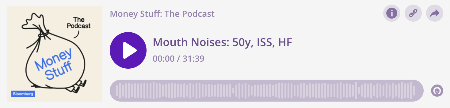 | This week’s episode of the Money Stuff podcast is out now, in which Katie and I discuss ASMR, 50-year mortgages, Fannie and Freddie, housing as a positional good, indentured servitude, assumable and/or portable mortgages, Matt’s mortgage rate, optimal exercise of prepayment options, proxy adviser competition, shareholder proposals, good governance, index fund voting, hedge fund talent constraints, gardening leave, the Black Death and the AI Ph.D. pipeline. You can listen to this week’s episode here: You can get Money Stuff: The Podcast at Apple, Spotify or wherever you get your podcasts. We’d love your feedback. You can email us at moneypod@bloomberg.net. |