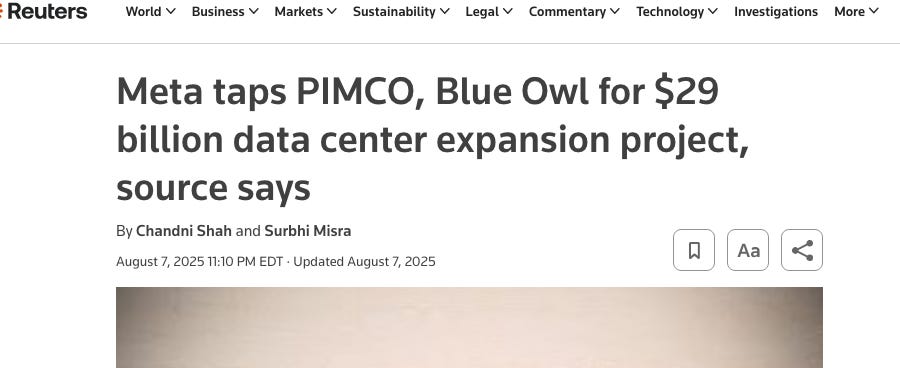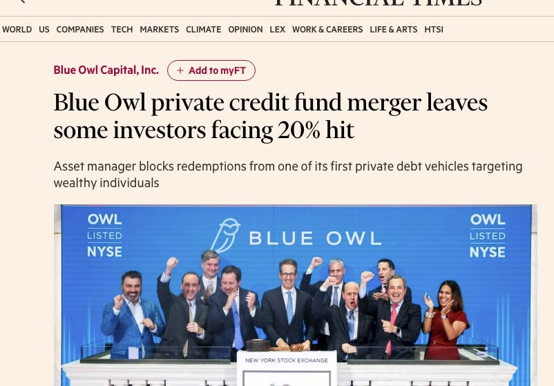 Monopoly Round-Up: More Scary Economic SignsSomething's weird as AI-focused shadow bank Blue Owl runs into trouble, there are 'phantom data centers,' and the Fed sees volatility in money markets. Plus more Lina Khan derangement syndrome in NYC.Lots of monopoly-related news, as usual. YouTube and Disney settled their battle over pay-TV, Lina Khan may try to cut the price of hot dogs at sporting events, and new evidence proves that corporate concentration is a cause of inflation. The biggest story of the week in terms of monopoly was the release of disgraced financier Jeff Epstein’s emails with a variety of powerful economic and political figures. But I wrote about that yesterday and I don’t have much more to say. Instead, I want to make a few observations about some odd signs about the economy that emerged this week. And I’d like your feedback on what you’re seeing. Let’s dive in. A few months ago, I asked why our economy, despite steady growth in official numbers, feels so creepy and unstable. My conclusion was that the U.S. is in a “Chinese finger trap” economy. We are dependent for growth on monopolies and an AI bubble, which juices the all-important stock market. Trying to grow an economy in a more stable way could lower stock prices which would paradoxically lead to a downturn. So we’re stuck, until some outside event occurs. This week, there was an announcement from an AI company most people haven’t heard of named Blue Owl. Blue Owl is a shadow bank that is funding key parts of the data center build-out. Like a lot of fly-by-night companies jumping into this area, the company has opportunistic origins. It started as a private equity play on real estate just after the financial crisis, went public in 2019 in a sleazy manner known as a special-purpose acquisition company, or SPAC, and rolled up a bunch of similar funds. Today, it’s providing cheap capital to Meta. Blue Owl is an entity known as a “business development corporation,” which is to say, an unregulated shadow bank. During the financial crisis, shadow banking got a bad name, so it rebranded as “private credit.” But it’s the same thing, these are entities who accept investment/deposits and then invest that capital in risky assets. Investors, largely wealthy individuals and institutions, assume they can withdraw their investments when they choose, similar to a bank. During the financial crisis, the shadow banking sector had trouble meeting requests for redemptions. This week, the company made an announcement with significant implications. Here’s the Financial Times.