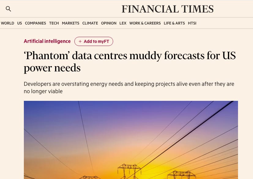 I don’t know if this announcement has any broader implications. But in my conversation about the AI bubble with long-time Wall Street analyst Herb Greenberg on Organized Money, Blue Owl came up as a key financing vehicle. And the fact that the company is willing to freeze out investors strikes me as, well, striking. Here’s another notable sign of something weird in the economy writ-large. Data center developers are now approaching multiple utilities with proposals for the same project, leading to “phantom” forecasts of demand that isn’t actually there. Essentially, it’s hoarding. Hoarding is what happen in overheated markets, such as the post-Covid moment when everyone was looking for chips. But this can lead to something called the “bullwhip effect.” Buyers overstate how much they want to buy in the hopes they’ll get something that is in shortage, and then when suppliers start making more of it, all of a sudden the demand evaporates because it was never real in the first place. This dynamic can throw an economy into an overheated state, and then a depression; that’s what happened globally after World War I, leading to, among other things, Mussolini’s takeover of Italy. Are we seeing mass hoarding of data center capacity? Who knows? I mean, the immense build-out from blue chip firms continues. This week, Google announced it is investing $40 billion in data centers in Texas. And “Anthropic announced that it will invest $50 billion in data centers across the US, including in New York and Texas, which has an abundance of land and relatively cheap energy.” So the investment boom is continuing. At this point, data centers are pretty much what’s growing in America. I recently had a conversation with an elected official who told me that data center construction is a huge construction jobs boost in rust belt areas. The template he sees are old closed down factories linked to a power source, being revamped with a new natural gas turbine to run giant server farms to power artificial intelligence. He posited a tension between political support for the new temporary jobs and political anger over higher electricity prices. We have a one-legged economy, with the AI build-out serving as a driver of real estate values, the stock market, and GDP growth. It’s central planning, Silicon Valley-style. OpenAI’s Sam Altman scared Wall Street and D.C. a few weeks ago when he came out and pretty much said his company would need a bailout at one point, that AI is too big to fail. But his point isn’t crazy. If you want a nice deep dive into the problem, the Center for Public Enterprise has a good report titled “Bubble or Nothing.” In it, Advait Arun discussed the subtle use of accounting tricks to disguise the losses, as well as the problem of rapidly dropping value of the GPUs which are the keystone asset of data centers. Here’s the key point: