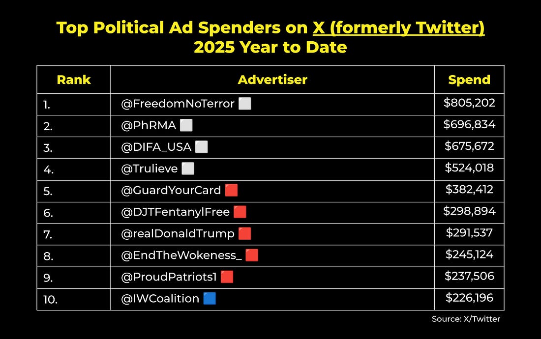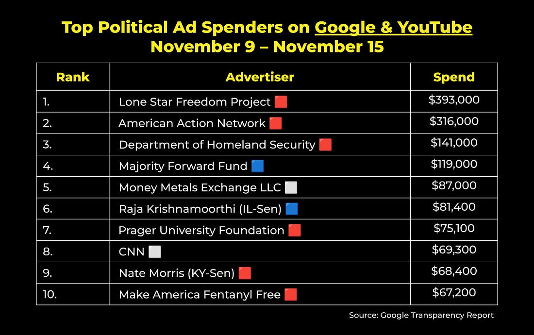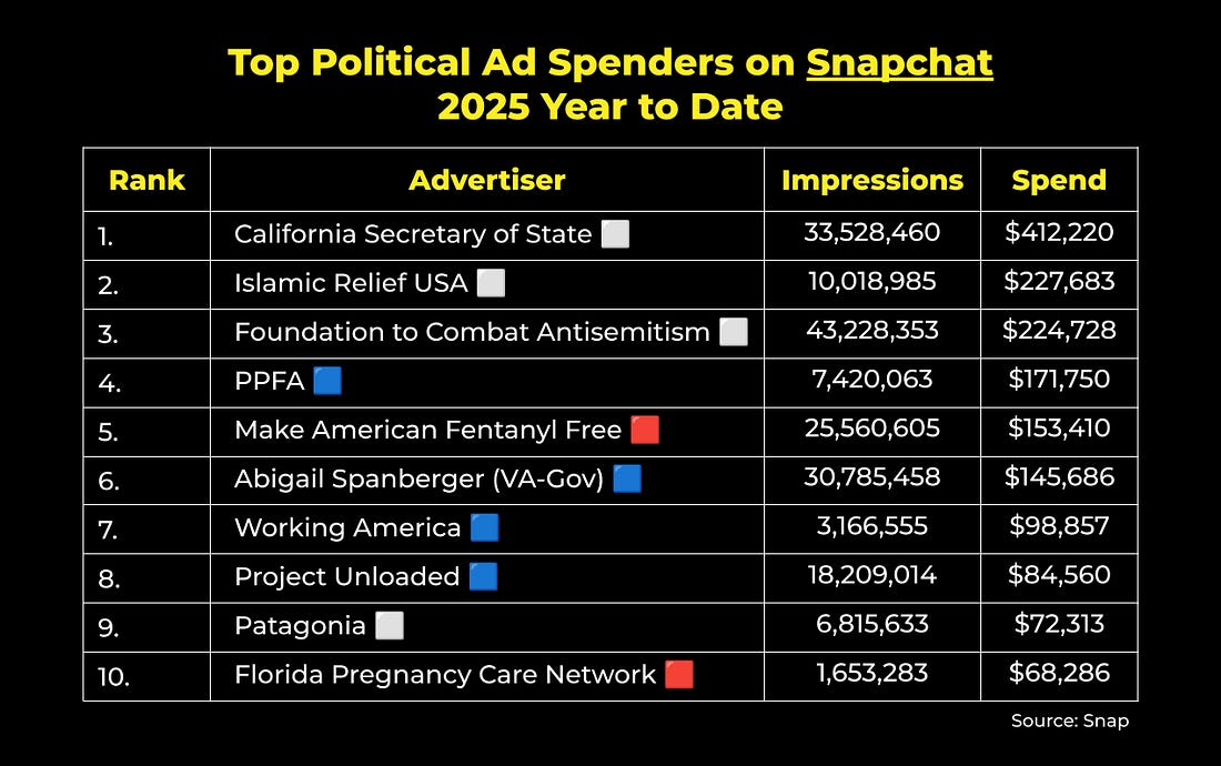 On X (formerly Twitter), political advertisers in the U.S. have spent around $11.1 million on ads in 2025. According to X’s political ad disclosure, here are the top spenders year to date: …and lastly, on Snapchat, political advertisers in the U.S. have spent around $2.8 million on ads in 2025. Here are the top spenders year to date: Can Aftyn Behn Flip The Table In This Southern MAGA Stronghold?November’s election day was huge. Democrats of every stripe won races, and the anti-Trump coalition turned out with force. But as some conservatives pointed out, many of those wins came in blue states. For the final test of 2025, we’re heading to Middle Tenneseee to see how much things have shifted since Trump’s 22-point victory a year ago. Let’s start with the basics. The district is big; it includes parts of Nashville, as well as rural farmland that extends to the Kentucky and Alabama state borders. Nashville is known for being a music industry hub, but what’s less known is that the district and area are home to MAGA influencers like Brett Cooper, Candace Owens, and Ben Shapiro, and GOP officials like Gov. Bill Lee and Sen. Marsha Blackburn. This is the first competitive race in this district since Tennessee Republicans created it by cracking a Nashville Democratic seat. The candidates are MAGA Republican Matt Van Epps and progressive Democrat Aftyn Behn. Election Day is December 2nd and the latest polling has Van Epps up by 8%. That sounds like a comfortable lead, but under the hood, there are warning signs for Van Epps. Last week, Cook Political Report shifted its rating from ‘Solid GOP’ to ‘Likely GOP,’ citing concerns over low Republican base enthusiasm. (Was this made worse by Gov. Lee scheduling the election the Tuesday after Thanksgiving to bury it? Who’s to say.) Meanwhile, local and national Democrats have jumped in, excited by the prospect of an end-of-year upset. To the dismay of some who want to keep the race local, Vice President Kamala Harris and DNC Chair Ken Martin visited the district, and Rep. Jasmine Crockett appeared virtually with Behn. Plus, the liberal Your Community PAC announced a $500k blitz of mailers and ads featuring Van Epps as a puppet. Trump-world responded in kind, jumping in with a seven-figure ad buy and setting up a “tele-rally” featuring Trump and Van Epps. With this context, how are the candidates pitching themselves and framing each other? Van Epps is leaning into his military background and allegiance to President Trump. He served 9 combat tours in Afghanistan and is pitching this campaign as his “new mission” to help the president. By his own account, he’s with Trump “100%” including joining him in flip-flopping on how to handle releasing the Epstein files. From Van Epps’ POV, Trump’s late endorsement helped him win his crowded Republican primary, so he’s all in. His offensive playbook features standard MAGA attacks: framing Behn as a radical who’s anti-law enforcement and pro permanent sex-changes for minors. What a time. Meanwhile, Behn isn’t running to the center. Instead, she’s running an unapologetically progressive campaign centering economic populism. Her background is as a state representative, a social worker and a political organizer, and her slogan is ‘Feed Kids. Fix Roads. Fund Hospitals.’ She has taken positions including eliminating Tennessee’s grocery tax, legalizing cannabis to fund highway repairs (or “pot for potholes”), and not taking money from corporate pacs or AIPAC. Fit for 2025, she regularly posts direct-to-camera videos discussing the race and key issues. Financially, Van Epps is clearly in the stronger position. Even before MAGA Inc’s announcement, Van Epps had raised double what Behn had raised ($402k vs $188k). Plus in his primary, Van Epps was supported by an ad buy of over $2.5 million from independent groups funded by billionaires like Jeff Yass. Van Epps brought in so much outside money that his primary opponent recently was on local news talking about it. Ultimately, Polymarket gives Behn around a 10% chance of flipping the seat. But if you’re looking for some hopium, Democrats were on the positive end of polling error in the November 4th elections (for once). Governor-elect Mikie Sherrill outperformed her polls by eight points, and Virginia Democrats outperformed their polls by at least four points. Also, Dems have been outperforming Harris’s 2024 numbers by an average of 18 points in this year’s congressional special elections. Will Republican rule survive like it did with the two special elections in Florida? Or will Democrats pull off a massive upset? With only 11 days until Election Day, stay tuned – it’s bound to be exciting. Add donors to your list before year-end comes knocking