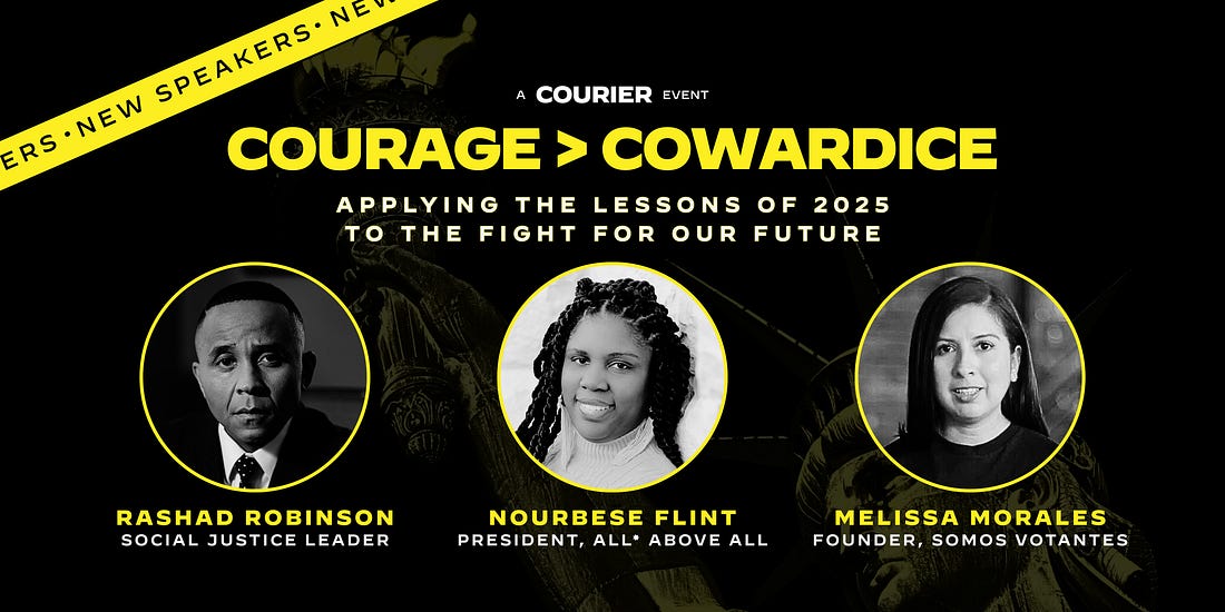 We’re excited to announce speakers Rashad Robinson, Nourbese Flint, and Melissa Morales for the Movement Building for This Moment panel at COURIER’s Courage > Cowardice live event! That’s it for FWIW this week. This email was sent to 24,682 readers. If you enjoy reading this newsletter each week, would you mind sharing it on X/Twitter, Threads, or Bluesky? Have a tip, idea, or feedback? Reply directly to this email. Support COURIER’s JournalismDemocracy dies behind a paywall, so our journalism is and will always be free to our readers. But to be able to make that commitment, we need support from folks like you who believe in our mission and support our unique model. |