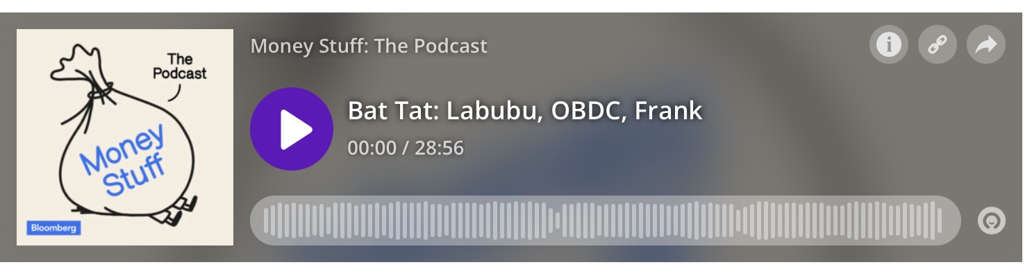 | This week’s episode of the Money Stuff podcast is out now, in which Katie and I discuss Batman, Labubu binary options, sneaker manipulation, publicly traded private credit, OBDC, OBDC II, private credit marks, Frank’s email list, indemnification and cellulite butter. You can listen to this week’s episode here: You can get Money Stuff: The Podcast at Apple, Spotify or wherever you get your podcasts. We’d love your feedback. You can email us at moneypod@bloomberg.net. |