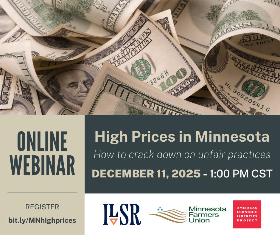 Rail Merger We have mentioned before the mega merger proposed between Union Pacific and Norfolk Southern. The merger would give the new combined rail company control of over half the freight market and establish the first transcontinental rail company in US history. More Perfect Union has a new video detailing how the merger will impact workers, farmers and consumers. Big Ag This headline from National Farmers Union says it all. “Thanksgiving by the Numbers: Families Pay More While Farmers Earn Less.” As middlemen continue to dominate agriculture consumers are paying more while farmers and ranchers earn less. Private Equity Destroying famous retailers, gutting healthcare and rolling up main street small businesses is clearly not enough for the vultures of the private equity industry. Luke Goldstein at The Lever has a phenomenal piece detailing private equity’s entry into youth sports with Black Bear Sports Group, a particularly egregious villain in youth hockey, sitting front and center. SOME GOOD NEWSLina Khan & Jon Stewart Former FTC Chair Lina Khan, who is now co-chairing New York City Mayor-elect Zohran Mamdani’s transition team, stopped by Jon Stewart’s podcast to discuss Mamdani, corporate power and how to build a fairer economy. Check it out! The Fair Fight Pod Former FTC Commissioner Alvaro Bedoya and antitrust attorney Max Miller are starting a podcast called the Fair Fight Pod. You can sign up at the thefairfightpod.com to be kept in the loop as they look to launch the program in 2026. In preparation for the launch of the show Bedoya and Miller will be trying out some different things via YouTube live and other places. Unfair Pricing Webinar A shameless plug, but join Minnesota Farmers Union, the American Economic Liberties Project and the Institute for Local Self Reliance for a webinar on the ways corporations are using unfair pricing practices to raise costs and what we can do to address it. You can register at this link. Solutions for Unfair Pricing Speaking of addressing unfair pricing practices both the Open Markets Institute and the American Economic Liberties Project have new resources on how policymakers at all levels can address some of the root causes for our affordability crisis. Claire Kelloway wrote this brief for Open Markets and AELP has launched The Fair Price Fight campaign. Check them out! BEFORE YOU GOBefore you go, I need two things from you: 1) if you like something, please share it on social media or the next time you have coffee with a friend. 2) Ideas, if you have any ideas for future newsletter content please comment below. Thank you. Break Em Up, Justin Stofferahn |