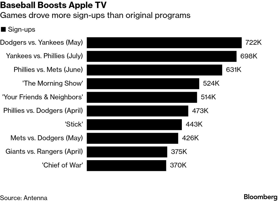 The Trump doctrine of mediaDonald Trump doesn’t want broadcast networks to get any bigger. Specifically, he doesn’t want NBC and ABC, which he says are biased against him, to get any more powerful. These comments prompted a lot of confusion. Brendan Carr, the Trump-appointed chair of the Federal Communications Commission, has been pushing for consolidation of local station ownership. Trump’s remarks were initially interpreted as conflicting with Carr’s, but that’s not necessarily the case. Local station owners like Tegna and Nexstar could merge without the major networks getting any larger or more influential. In fact, mergers of local broadcasters would give station groups — a couple of which have conservative owners — more power in negotiations with networks. Trump didn’t criticize CBS, the broadcast network owned by Paramount Skydance. That company is controlled by the Ellisons, whom the president sees as friendly. The Ellisons are also attempting to buy Warner Bros. Discovery, which would make them far more powerful. So Trump is saying broadcast networks owned by his friends can do deals. Broadcast networks owned by others (aka arms of the Democratic Party) shouldn’t. Speaking of TV consolidation … Scripps is trying to thwart a takeover attempt by Sinclair, the latest proposed merger in local broadcasting. The hottest band in the world is…Geese. The four-person rock band out of New York is being pursued by several major record labels. The group recorded its first three albums with Partisan Records, a New York-based independent label that has worked with many good young rock bands, including Idles and Fontaines D.C. PIAS, a business recently acquired by Universal Music Group, helped with distribution. Geese’s latest album, Getting Killed, is the group’s most successful by far. Major labels want to jump on a hot band early before it’s potentially headlining festivals. Baseball provided a big lift to AppleMajor League Baseball games drove more sign-ups for Apple TV than shows like The Morning Show and Your Friends & Neighbors, according to research from Antenna. A May game between the Los Angeles Dodgers and New York Yankees led more people to sign up for Apple than any other program between April 2025 and September 2025 (aka baseball season). Individual games accounted for six of the 10 biggest sign-up pushes in that span. ![]() Baseball fans are less likely to stick around given the relative paucity of sports on Apple. But the benefits of the sign-ups weren’t completely erased by the cancellations. The data are part of a larger study about the importance of sports to streaming services. Events like the Canelo vs. Crawford boxing match drove more sign-ups for Netflix. Weekly playlistI’ve seen a lot of new movies over the last few weeks. The best of the bunch was Marty Supreme, aka the A24 ping pong movie, which isn’t technically out yet. It Was Just an Accident was second, followed by House of Dynamite. More from BloombergGet Tech In Depth and more Bloomberg Tech newsletters in your inbox: