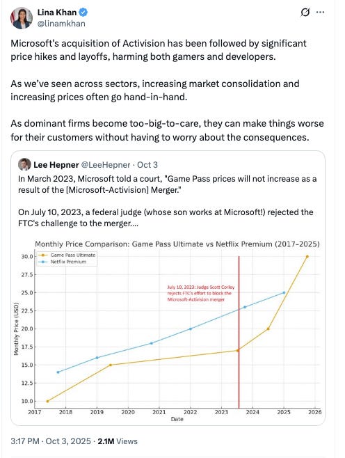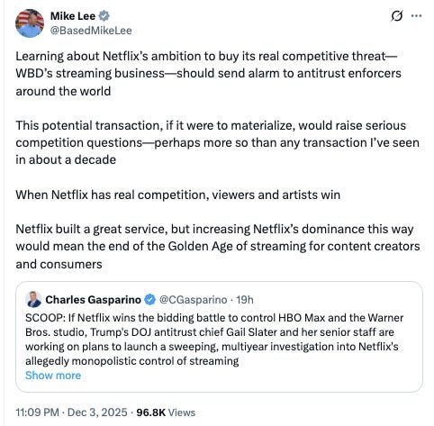 It’s actually worse than it looks, because Sabre and Visa, as a result of their attempted mergers, eventually also drew monopolization charges. If Netflix wanted to set itself up for a monopolization case, an ill-fated attempt to buy Warner Bros Discovery would be a good way to get a bunch of internal documents over to enforcers. One way to understand whether this deal is legal is to look at a very similar merger than happened a few years ago, since judges work through analogy. In 2022, Judge Florence Pan blocked the largest book publisher in America, Penguin, from buying its major rival, Simon & Schuster. At the time, the lawyers for the merger said the industry had to consolidate to compete with Amazon, technology required economies of scale, yada yada. The case against the merger was pretty simple; five book publishers combining into four meant fewer opportunities to publish interesting books and less money for writers. The attempt to merge Warner Bros Discovery with a rival is a dynamic that is very similar to Penguin/Simon & Schuster. There were five major publishers trying to consolidate to crush the bargaining power of authors, in this case there are five major studios trying to consolidate to crush the bargaining power of writers, directors, and actors. There was a “tech” argument in the form of Amazon for books, for content that argument is in the form of streaming and YouTube. Additionally, we saw what happened when the number of major book publishers dropped from six to five in a previous merger, which was a decline in bidding intensity for books. We’ve seen the same thing after the Disney/Fox combination. After Judge Pan blocked the Penguin/Simon & Schuster, private equity giant KKR bought Simon & Schuster. And while there was a lot of concern that KKR would be a problematic owner, I’m told that what happened was the opposite. The company invested more in new imprints and titles, and Simon & Schuster is now profitable and flourishing. Meanwhile, the CEO of Penguin was fired. We don’t hear a lot about this situation, because KKR keeps the financials private. But also, Wall Street dealmakers don’t like to tell a story about the virtues of a deal that didn’t happen, the value of competition. It’s always consolidation will happen, it’s inevitable. But it’s not. We can also look at the flip side; when Microsoft bought Activision, and a judge did not block that deal, there were mass layoffs and prices went way up for gamers. Something similar is likely here. All of the streamers have been raising their prices, led by Netflix. That trend will accelerate with consolidation. And that brings me to the politics. This merger will overseen by the Justice Department, foreign enforcers, and a host of state attorneys general. It’ll be a long drawn out process. If Trump decides he doesn’t like the deal, then the Antitrust Division will challenge it. But even if he doesn’t, or settles a deal in ways that are problematic, other enforcers can oppose it. The politics of antitrust in this environment are complex, but they initially line up against this acquisition deal. In the bidding process, Paramount tried to convince Warner’s board that their Netflix’s proposal was illegal. For instance, Paramount’s David Ellison hired former Trump Antitrust Division chief Makan Delrahim, and their pitch was that the Trump administration will let them do the merger, but won’t let anyone else. You can expect meaningful GOP opposition to this deal, unless Netflix chooses to curry favor with Trump with donations, promised changes to content, and so forth, or finds a way to get his Silicon Valley advisors to persuade him to accept it. On the other side, there was strident opposition to the GOP-leaning Paramount getting control of Warner Bros Discovery because of fear that Trump would revamp CNN in a way that would make it more right-leaning. So with Netflix buying Warner Bros Discovery, there is some softening to this merger among certain Democrats. Here, for instance, is Biden official Neera Tanden. And yet, it’s not like the Democrats as a whole are going to be favorable. Hollywood creatives dislike Netflix’s acquisition, and they are likely to determine how Democrats respond. More broadly, Democrats are coming to understand that consolidation is a problem. Yesterday, Jane Fonda put out a piece in The Ankler making that very point, noting “how this administration has used anticipated mergers as tools of political pressure and censorship.” She cited using antitrust hurdles to change news coverage, as well as the attempt to fire Jimmy Kimmel. And called up antitrust enforcers to protect free speech.