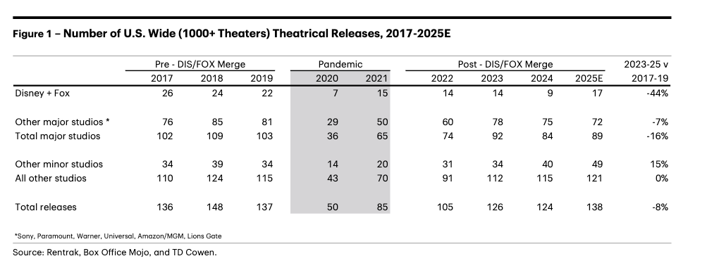 Already, filmmakers are coming out anonymously saying that the streaming giant, if the deal goes through, would “Hold a Noose Around the Theatrical Marketplace.” Just the fact that creative powerful storytellers are afraid of opposing this deal publicly should tell us something. The deal looks illegal and is likely to face a merger challenge, which I’m going to go into. It may ultimately even prompt a monopolization case against Netflix. First, let’s talk about why this deal is happening and why it’s problematic. Warner Bros Discovery is one of five remaining major film studios and the third biggest streamer via HBO Max (after Netflix and Amazon Prime). It has a lot of great assets, including “franchises like DC’s superheroes, Harry Potter, Lord of the Rings, Game of Thrones, Looney Tunes and Scooby-Doo. It is also the distributor of Legendary’s Dune franchise and Godzilla and King Kong films.” Warner Brothers has been sold multiple times in the last 30 years under the same premise that consolidation is necessary, and every single time the merger has been a failure. Nevertheless, they are still at it. For the last eight months, there’s been an auction of Warner Bro. Discovery. The CEO of the company, David Zaslav, is a reviled executive who has done a poor job for shareholders and filmmakers, but will nonetheless get paid $500 million if the deal closes. But Zaslav is just the help, the real power here is cable billionaire John Malone. There were multiple bidders in the process. Comcast/NBC and Paramount were the others, they owned traditional studios. Netflix, however, is different. It doesn’t release its content into theaters, and most people think that the goal of Sarandos is to kill the entire movie theater business in favor of streaming. One very obvious problem with this deal is that movie theaters right now are in a precarious position, and Netflix will likely push them over the edge. A theater needs a certain number of new releases to be profitable, and are very close to that line right now. Previous mergers have actually cut the number of theatrical releases. Take the last big merger, when Disney bought Fox in 2019, cutting the number of major studios from six to five. The number of theatrical releases collapsed. Here’s a chart and commentary from investment bank TD Cowen making the point.