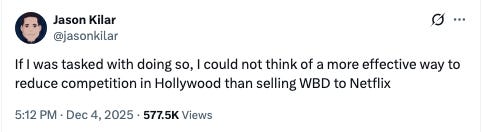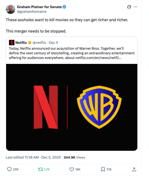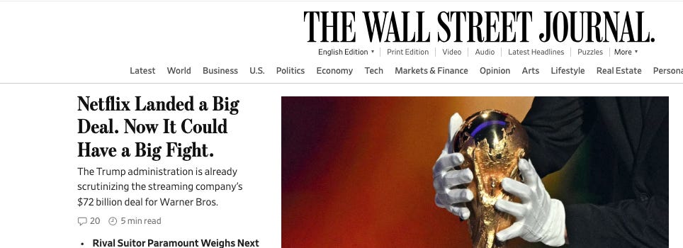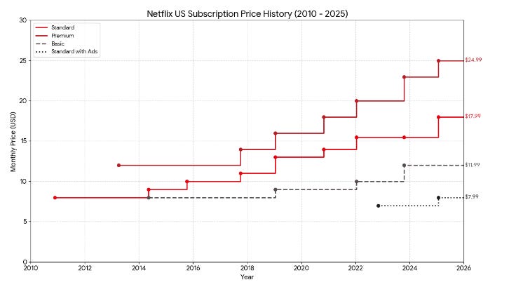 Monopoly Round-Up: Netflix Prices Have Gone Up 125% Since 2014Today, Donald Trump said the Netflix-Warner merger "could be a problem." Does Netflix even want to close the deal? Plus, the NASCAR antitrust case continues, and cowboys are very mad at meatpackers.The monopoly round-up is out, and there’s lots of news, as usual. Judge Mehta came out with the final detailed order on the Google search monopolization trial, Michael Jordan thinks he’s going to be beat the NASCAR monopoly, and Larry Summers has been kicked out of the economics fraternity. But this week, the big news is all about Hollywood. On Friday, Netflix announced its $83 billion acquisition of much of Warner Bros Discovery, a deal that combines the top paid streamer and the number three streamer, by subscriber count. There are many ways to see this deal, but the starting point has to be how angry the public was when it was announced. I was surprised to see an endless series of viral comments on social media mocking Netflix’s pricing and disrespect of movies. For instance: If there’s one fact to explain why people are so unhappy, it’s that Netflix subscription prices have gone up 125% since 2014, which is four times the overall rate of inflation. Americans think Netflix is greedy, and that it has exploited its market power to raise prices. Here’s a chart I put together showing the different tiers of service and the pricing changes. It’s not lost on people that the increased prices have turned Netflix’s founder into a billionaire, and that if the deal goes through, current Discovery CEO David Zaslav will get such a big payday that he’ll become a billionaire as well. And prices are likely to continue to go up. Why? Well, as the Entertainment Strategy Guy notes, “this deal needs to boost Netflix’s cash flow by $8 billion per year for the next 20 years to justify itself. That’s a lot of extra money to make from an acquisition.” The best way to increase cash flow is to keep increasing prices. On Friday, I went on CNBC on Friday to explain why the deal is bad, and why Warner should remain independent. I also had a longer conversation with The Ankler’s Richard Rushfield and former FTC Commissioner Alvaro Bedoya on the topic. The more I dig into it, the weirder the deal seems. Does Netflix Even Want to Close the Deal?There are a few unusual aspects to this transaction. The first is something that is important to note upfront - as Nick LoPiccolo of the Hollywood Reporter observed, Netflix may not care that much if it is actually able to finalize the deal. Controversial mergers take between 18-24 months to close, and in that time period, the company being bought is paralyzed. And that means Netflix gets to freeze important rival - Warner’s HBO Max - for the next couple of years, regardless of what happens. Think about it this way, if someone is pitching a movie or TV show to Warner and Netflix as this deal is pending, who are they likely to choose? There are a few other advantages. For the time this deal is pending, Netflix also blocks another rival, Paramount, from buying Warner, giving it more of an opportunity to cement its lead in streaming. There’s another big advantage of the bid for Netflix, which is that it will get access to competitively sensitive information about a significant rival. The counter to this point is that Netflix will have to pay a big break-up fee, $5.8 billion or 7% of the size of the deal, if it doesn’t go through. And in the merger documents, it has pledged aggressively to litigate this one, including through any and all appeals. Still, $5.8 billion in the context of an $82 billion deal is not that much. For a frame of reference, Google offered a $3.2 billion break-up fee to Wiz for a much smaller $32 billion transaction, which is a 10% fee. An Unpopular DealThe second odd part of this proposed deal is that the business and trade press did not immediately take the side of the merging parties. It’s almost always the case that the media cheers for consolidation, or at least says it’s inevitable. Yet that didn’t happen in this case. Here, for instance, is the Wall Street Journal’s headline on Friday. And the industry press is also skeptical, at least for now. The chief film critic for Variety, Owen Gleiberman, attacked the combination, saying “It is hard, at this moment, to resist the suspicion that the ultimate reason Netflix is buying Warner Bros. is to eliminate the competition.” The Hollywood press never opposes mergers, they love deals. But not this time. Why is that? Well, this deal isn’t a normal “make a quick buck” fling, it’s existential for the industry, because it will kill the major experience of seeing a film. While a lot of people think that movie theaters are dying, in fact that’s not true; a bunch of youth-oriented movies are actually starting to draw kids back to the movie theater. However, if Netflix does buy Warner and limits theatrical releases the way people expect, it will be game over. “I spoke with a major executive in theatrical exhibition,” said Ben Steinberg. “They said to expect North America to lose 5 thousand screens under a Netflix controlled WB within 5 years.” Other major studios, especially Paramount, which is owned by Oracle founder Larry Ellison, are in a dangerous position. If Netflix gets the deal through and does kill theatrical exhibitions, smaller studios will have enormous trouble competing in the entertainment business. In other words, there’s a reasonable chance the movie industry will basically end after this deal. And it’s not just me saying that, the New York Times just published an op-ed by the former head of Amazon Studios saying that this combo “will be the end of Hollywood.” Another unusual part of this deal is unlike most debates over business law, this attempted purchase broke into the mainstream. Americans have very strong views about TV and movies, because Hollywood is our cultural lingu