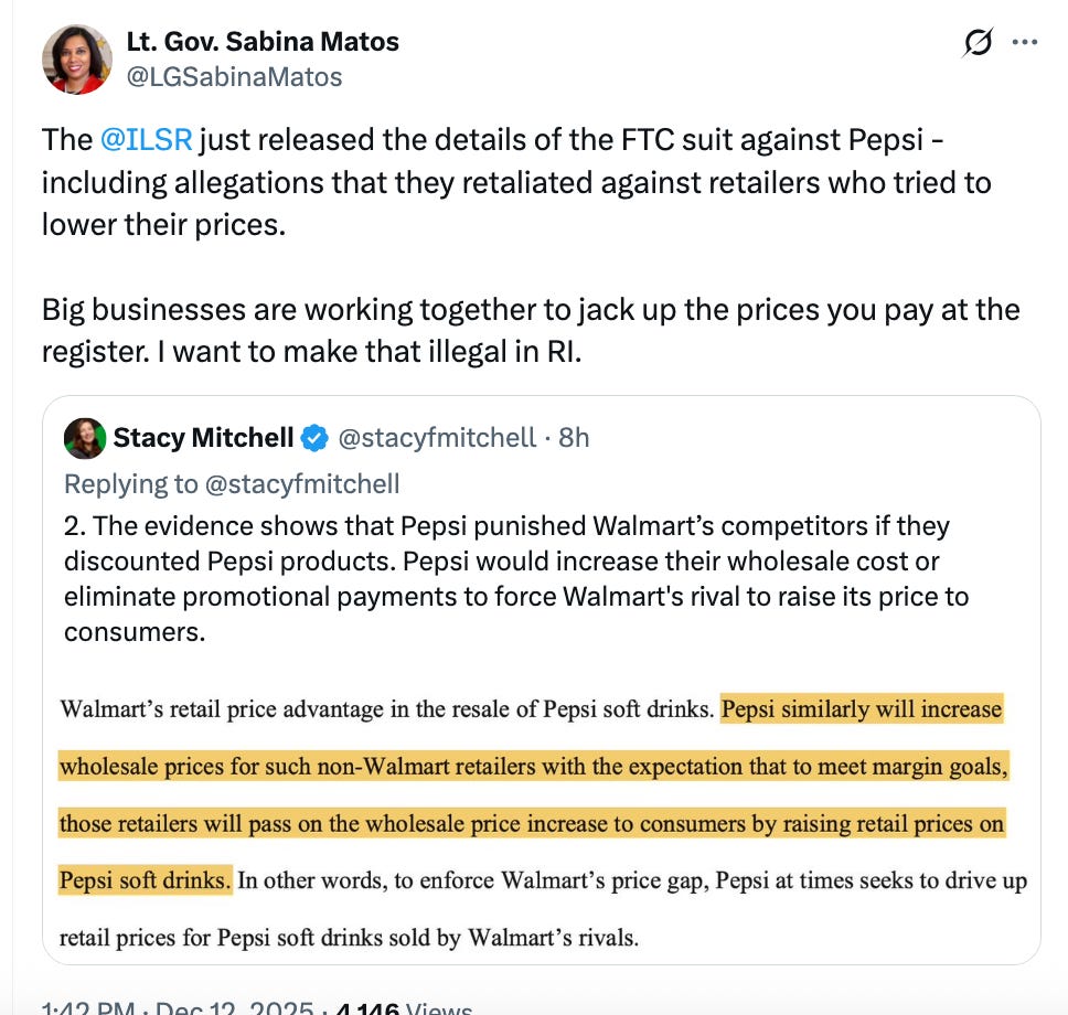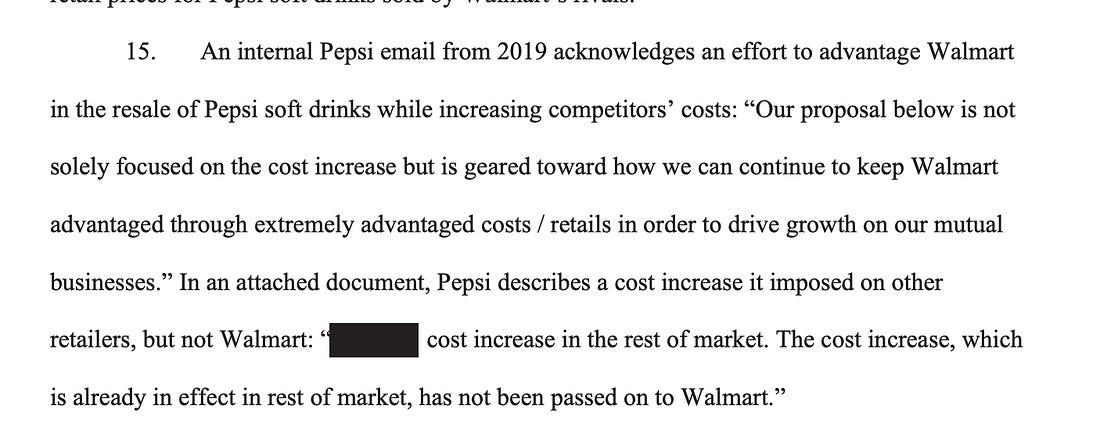 Secret Documents Show Pepsi and Walmart Colluded to Raise Food Prices Across the EconomyThe Trump FTC tried to hide a complaint showing Pepsi forced shoppers to pay higher prices everywhere but Walmart. But now it's unsealed. And the politics of affordability are explosive.Last month, the Atlanta Fed came out with a report showing a clear relationship between consolidation in grocery stores and the rate of food inflation. Unsurprisingly, where monopolies prevail, food inflation is 0.46 percentage points higher than where there is more competition. The study showed that from 2006-2020, the cumulative difference amounted to a 9% hike in food prices, and presumably since 2020, that number has gone much higher. Affordability, in other words, is a market power problem. And yesterday, we got specifics on just how market power in grocery stores works. The reason is because a nonprofit just forced the government to unseal a complaint lodged by Lina Khan’s FTC against Pepsi for colluding with Walmart to raise food prices across the economy. A Trump official tasked with dealing with affordability tried to hide this complaint, and failed. And now there’s a political and legal storm as a result. Let’s dive in. Everyone knows the players involved. Pepsi is a monster in terms of size, a $90 billion soft drink and consumer packaged goods company with multiple iconic beverage and food brands each worth over $1 billion, including Pepsi-Cola, Frito Lay, Mountain Dew, Starbucks (under license), Gatorade, and Aquafina. Walmart is a key partner, with between 20-25% of the grocery market. Pepsi was also a key player in the post-Covid ‘greedflation’ episode. “I actually think we’re capable of taking whatever pricing we need,” said CFO Hugh Johnston in 2022. And the company did just that, raising prices by double digit percentages for seven straight quarters in 2022-2023. The allegation is price discrimination, which is a violation of the Robinson-Patman Act, a law passed in 1936 to prevent big manufacturers and chain stores from acquiring too much market power. The specifics in the complaint are that Pepsi keeps wholesale prices on its products high for every outlet but Walmart, and Walmart in return offers prominent placement in stores for Pepsi products. This approach internally is called a “price gap” strategy. It’s a partnership between two giants to exclude rivals by ensuring that Walmart has an advantage over smaller rivals in terms of what it charges consumers, and so that Pepsi maintains its dominance on store shelves. This partnership comes in a number of forms. Pepsi offers allowances for Walmart, such as “Rollback” pricing, where specially priced soft drinks go into bins in highly visible parts of the store. The soft drink company gives Walmart “Save Even More” deals, online coupons and advertisements, and other merchandizing opportunities. Other outlets don’t get these same allowances, meaning they are charged higher prices. While Pepsi is a “must-have” product for grocery stores, Walmart is also massively powerful. In its investment documents, Pepsi notes that Walmart is its largest customer, the the loss of which “would have a material adverse effect” on its business. Walmart is so dominant that the internal communication of the two companies would show a comparison of prices at Walmart versus “ROM,” or “rest of market,” meaning grocery, mass, club, drug, and dollar channels. It’s everyone in the world versus Walmart. And Pepsi does a lot of alleged price discrimination to maintain the approval of Walmart. It goes far beyond special allowances and concessions to Walmart; Pepsi even polices prices at rival stores and prepares reports for Walmart showing them their pricing advantages on Pepsi products. When the “price gap” would narrow too much, Pepsi executives panicked with fear they might offend Walmart. They tracked “leakage,” meaning when consumers would buy Pepsi products outside of Walmart, which happened most often at stores where prices were more competitive. Pepsi kept logs on stores who would “self-fund” discounts, nicknaming them “offenders” of the price gap. It would note that where competition was fierce, such as in the Richmond-Raleigh-CLT corridor, it was harder to maintain a price gap for Walmart. This relationship went both ways; Walmart executives would complain to Pepsi if the “price gap” got too thin. To ensure that prices would go up at rival stores, Pepsi would adjust allowances, such as “adjusting rollback levers.” It would punish stores that refused to cooperate by raising wholesale prices. Retailers who were trying to discount Pepsi products to better compete with Walmart would find it increasingly difficult to do so; not only would Pepsi take away their promotional allowances, but they might find that discounting six-packs of soda would lead to Pepsi charging them higher wholesale prices for the soda. The FTC offered the example of Food Lion, a 1000-store chain in 10 states that cut prices on Pepsi products on its own to match or beat Walmart prices.