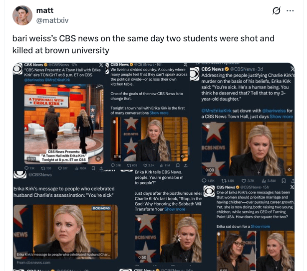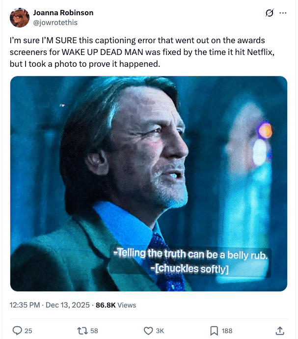 | This was dropped in the Discord by Mitch. | | This Weekend The Wheels Fell Off Of Everything | As podcaster Juniper wrote on X this morning, “There were like four distinct massive tragedies this weekend why was this weekend evil.” It was specifically a moment where it felt like America completely lost control of itself. Nearly 12 months of Trump 2.0 and Project 2025 and institutional rot culminating in a bloody, chaotic weekend. | On Friday, in case you needed video evidence of the Groyper Civil War, Groypers literally fought with each other outside of the New York Young Republican Club’s Christmas party this weekend. (They eventually apologized to each other.) | Meanwhile, we’re still no closer to finding the suspect behind mass shooting at Brown University thanks to FBI Director Kash Patel, once again, livetweeting the investigation, smearing a person of interest who was then released by authorities on Sunday. Patel’s FBI handled the case so poorly that Providence’s chief of police, during a press conference this weekend, openly blamed them for screwing everything up. The shooting also marked a moment that was assuredly going to happen eventually: A CNN reporter’s son was on campus during the attack and was interviewed by his father live on air. US Attorney General Pam Bondi is trying to do damage control this morning, announcing on X that, actually, the Department of Justice stopped a far-left, pro-Palestinian terror attack in California. | Director Rob Reiner and his wife Michele were also reportedly killed in their home Sunday night, though we have to say “reportedly” here because all of the reporting around it — as well the LAPD’s role in the investigation — could not have been worse. The LAPD, at first, refused to name the victims. And had even more trouble naming a suspect. Reiner’s son Nick was arrested, but not before social media filled up with every conspiracy theory imaginable about what could have happened. Add on to that, Trump, this morning, claiming on Truth Social that Reiner was killed for having “Trump derangement syndrome.” | And what was once-prestigious national broadcaster CBS covering all weekend? Erika Kirk’s town hall, of course. | | | Is Netflix Using AI For Their Subtitles Now? | | After finishing Netflix’s Wake Up Dead Man this weekend I raced to look up if anyone else noticed a very, very strange line of dialogue spoken by the film’s protagonist, Benoit Blanc. I’ve been a subtitles-on-TV person since 2020 and I couldn’t for the life of me figure out what Blanc meant by, “Telling the truth can be a belly rub.” It turns out the actual line is, “Telling the truth can be a bitter herb.” But this isn’t the first subtitling error like this I’ve noticed on Netflix this year. | Starting around August, more and more strange typos, grammatical errors, and incorrect homophones have popped up in Netflix subs. The newest season of Stranger Things was full of bizarre punctuation and flubbed lines when I watched it Thanksgiving weekend. And it stood out because Netflix used to have some of the best, most dynamic subtitling of any streamer. | It’s hard not to come to the conclusion that AI may be involved here. But if any Netflix employees would like to reach out and let me know what the heck is going on, you can message me securely on Signal at ryanbroderick.69420, happy to keep things anonymous or off the record! | | Reddit’s Evolutionary Tree | A user in the r/TheoryOfReddit subreddit “indexed 89,000 NSFW subreddits and accidentally discovered Reddit's hidden evolutionary tree.” This is one of those Reddit things where it’s, honestly, best not to question why someone would be indexing nearly 100,000 porn communities. That’s between them and whatever god they do or do not believe in. | But they wrote that they stumbled across a totally fascinating insight that makes a lot of sense and actually feels like one of those Rules Of The Internet that could be extrapolated across the entire web. “Reddit communities don't grow, they fracture,” the original poster wrote. | They argue that the minute a NSFW subreddit gets too big — they estimate 50,000 subscribers — mod drama emerges, usually arguments about what does or does not count. And then that subreddit splinters. “It's basically the moment a niche becomes distinct enough to need its own moderation rules, a new subreddit is born,” they wrote. | You can see the entire 90,000-subreddit index here, at NSFWDOG.com, if you, uh, want to do your own research, whatever that may mean for you. | | The Glovers Vs. Sliders War |  | Watch now on TikTok | @the.snapper13 | boi snapping so niche @infinite_puppet #gloving #snapping #niche #sussy |