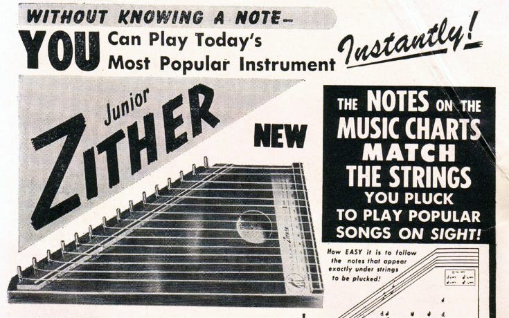 When I consider that there are hundreds, even thousands of musical instruments I’ve never heard of, it seems almost arbitrary which ones are familiar to us today. I’m Jason Toon and in this Shoddy Goods, the newsletter from Meh about consumer culture, I look at a moment when one of those obscure instruments broke through to the mainstream. They knew how to party in 1950 In the rubble of post-World War II Vienna, Carol Reed heard something he liked. The English film director came to town in 1948 to shoot The Third Man, a haunting tale of intrigue starring Orson Welles and Joseph Cotten, and written by Graham Greene. When he stopped in to a wine bar one night, Reed was captivated not by the drinks but by the music. Simple but rich, refined but gritty, and just exotic enough, it was played on a stringed instrument called the zither by a journeyman Viennese musician named Anton Karas. Reed thought the sound would be perfect for his movie. So, with translation help from bystanders, he asked Karas on the spot to come back to England with him and compose the film’s score. Karas tried to beg off, saying he’d never written music before. But Reed wouldn’t take no for an answer. The infectious tune Karas came up with - known as “The Harry Lime Theme” or “The Third Man Theme” - was one the biggest and most unlikely global hits of 1950. In the US, it spent 11 weeks at the top of the Billboard chart and was the 3rd-best-selling single of the year, just ahead of a competing version by bandleader Guy Lombardo. The bouncy little Middle European melody would propel both Karas and his instrument into the glare of the spotlight - a place neither of them were quite ready for. Meet the zither 34 strings and the truth. Watch Anton Karas play the zither “Zither“ refers to a whole family of stringed instruments where the strings don’t extend beyond the sound box. They don’t have necks, like guitars or violins. The strings aren’t stretched across an open frame, like harps. The family ranges from the Chinese guqin to the Appalachian autoharp to the West African adjulin. Think an acoustic guitar body without a neck, that you play on a table or your lap, and you’re in the ballpark. Karas specifically played a concert zither, with 5 melody strings on a fretboard (meaning each can play different notes depending on where it’s held down on the fretboard) and 29 accompaniment strings played open (so each can only play the one note it’s tuned to). The concert zither isn’t some improvised jug-band contraption. It’s as highly refined as any other instrument in the European musical tradition. Watch Karas playing it and it’s obvious the zither isn’t something where you can just pick it up and bang out a little tune. The sound hole gives the instrument its volume and resonance, and Karas’s special low tuning gives it its grit, but the fullness of the sound - hard to believe as one instrument - is all Karas. We are Viennese if you please Which is all well and good - but how do you get from that to a pop hit? Ahead of the movie’s release, MGM hired a maverick promo man named Jim Moran to travel around the country posing as a speculator buying up all the nation’s zithers. Moran would inform the local media that he’d pay $50 (about $650 today) for any used zither, before The Third Man made zithers a hot commodity. “I’ll be rich,” he told the Galveston Daily News, while insisting his quest had nothing to do with promoting the film. More likely, the tune’s inherent catchiness and freshness was enough to prick up American ears. Contrary to the stereotype of the staid whitebread ‘50s, a series of imported musical styles enjoyed brief vogues through the decade, from rumba and calypso to bossa nova and Irish folk. “The Harry Lime Theme” scratched that exotica itch first, and the zither craze was on. “Out of a basement” The door was open for a wave of zither-pop that would last a decade. Ruth Welcome‘s romantic solo zithering got her signed to Capitol Records, while Australia’s singing zitherer Shirley Abicair moved to London and became a bona fide star well into the ‘70s. Who’s ready to get zithered? At the grassroots level, the aging members of zither clubs from Buffalo to Honolulu found themselves unexpectedly aligned with the mainstream. Mostly Germanic immigrants and remnants of an early zither craze during the 1880s, these last zither diehards anticipated new blood. When a Portland, Oregon newspaper said the zither was dead, a dozen local players protested. “I have much hope,” said Adolph Robl, former president of the Zither Club of Baltimore, told the Baltimore Sun in 1950. There was just one problem: it was hard to find zithers. The only zither factory in America at the time was a one-man operation run by Albert Hesse of Washington, Missouri, who hilariously couldn’t have cared less about cashing in on the new fad. The St. Louis Globe-Democrat reported the 73-year-old craftsman was content to “putter about the plant a few hours each day”, repairing old zithers and filling orders for strings, paying no attention to the 10-20 mail requests from the newly zither-curious. “If I did, I’d never get any work done.” He closed down for good in 1954. What did Hesse think about Karas’s breakthrough hit? “I did not hear it,” he told the Chicago Tribune. “I guess they got the player out of a basement or a beer stube.” That’s the kind of talk that could start serious beef, except Karas had started to hate his signature tune, too. “This tune takes a lot out of your fingers,” he said. “I prefer playing ‘Wien, Wien’, the sort of thing one can play all night while eating sausages at the same time.” He was in demand as a touring act overseas, which he also hated. “It is because of that film that I was pushed from one place to the other,” Karas said. “My only desire was to be back home again.” So, with real instruments limited 