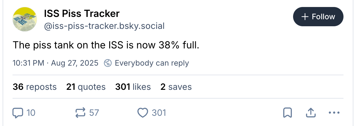 6. The day the ISS Piss Tracker on Bluesky went to 38% |