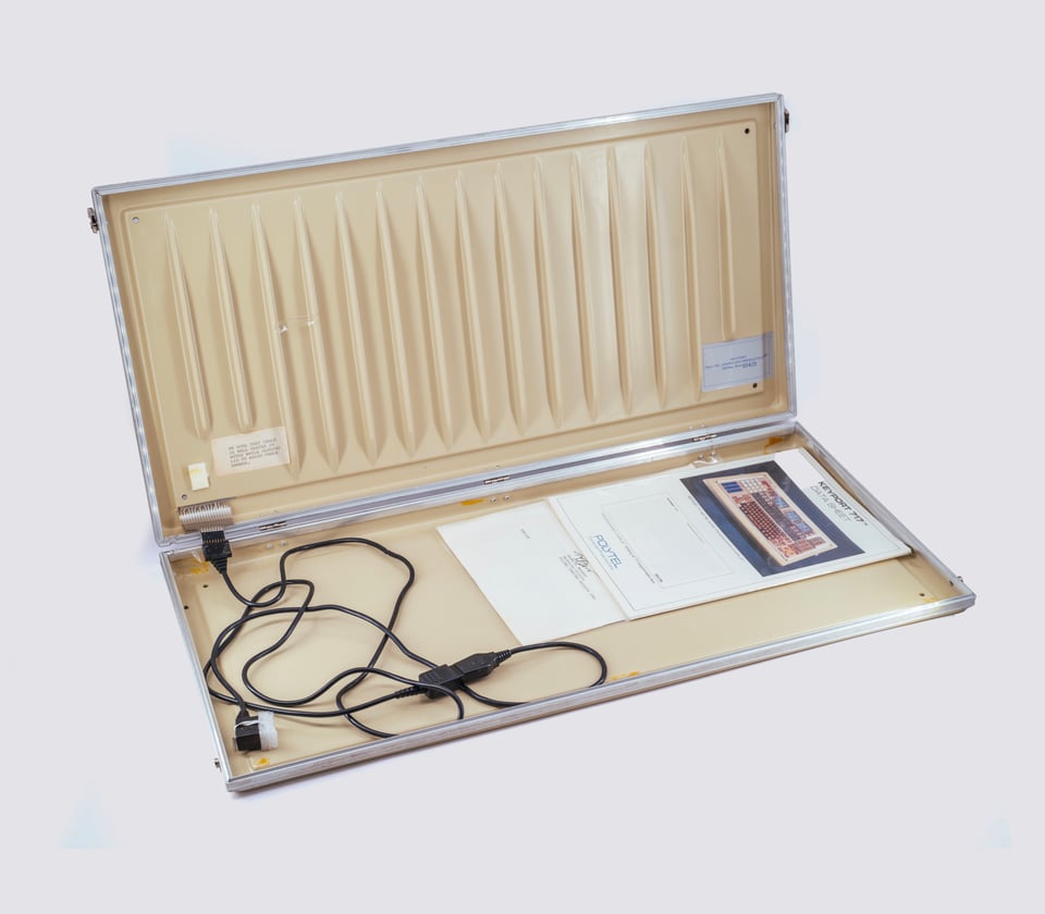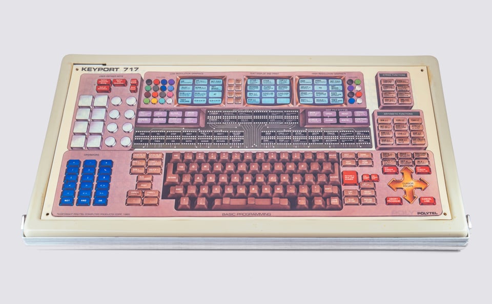 The keyboard is called Keyport 717. It’s from 1983, and meant to be connected to the then-still-wildly-popular Apple II. As the name might suggest, it sports 717 keys.