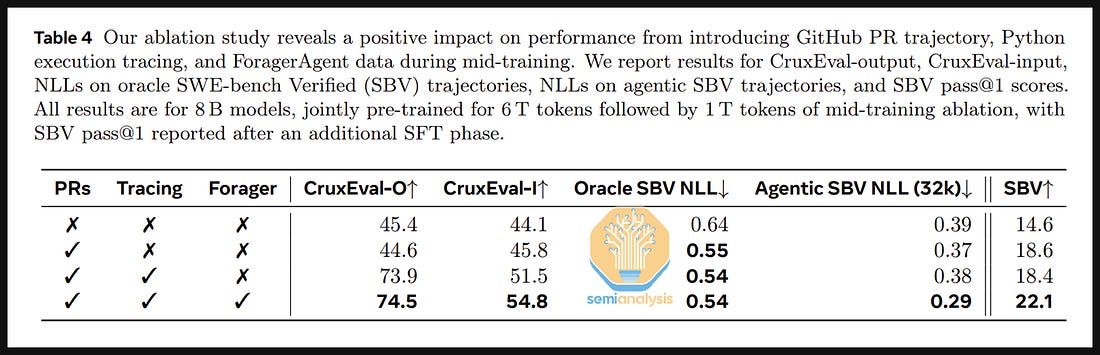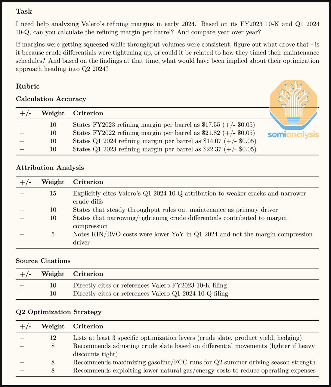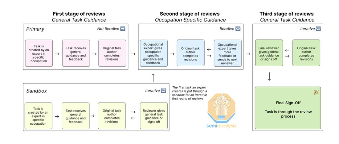 Each candidate task then undergoes execution-based verification. The environment is instantiated in a container, and tests from the PR’s test patch are executed. A task is considered valid only if at least one test fails before applying the solution patch, all initially failing tests pass after the patch is applied, and any tests that passed before continue to pass. After all the filtering, we end up with 21,336 tasks from the 450k we started. But most PRs do not meet the strict criteria, which is why the yield is low. SWE-smith demonstrates this by having an LLM install repositories at their latest commit, then synthesizing bugs through four methods: prompting a model to introduce subtle errors into working functions, applying deterministic AST transformations like flipping if/else blocks or removing loops, using an LLM to semantically reverse real PRs against the current codebase, and combining validated single-function bugs into harder multi-file tasks. Every candidate is validated by checking if it breaks at least one existing test. At scale, these pipelines produce tasks in the tens of thousands. DeepSeek ended up using 24,667 coding tasks extracted from GitHub for the training of V3.2. We know, from other labs like Kimi, that the infrastructure developed can support the instantiation of 10,000+ instances simultaneously. Generally speaking, the more difficult the task the more rollouts are needed during training. This is due to the problem being harder to solve, and the more rollouts, the more “shots on goal” the model has. However, this comes at the expense of each rollout being slower as throughput comes at the expense of speed. Data Foundries and Expert ContractorsThe reason environment tooling in general is useful is because environments are being created across many different domains: Chip design environments so models can aid in the design process, accounting ones for model to do taxes, and EHR software for medical use workflows are but few examples. While software engineers construct the environment itself, often the workflows are created, described, and graded by domain specific contractors involved in the environment creation process. Finance professionals help define financial tasks, doctors for medicine, lawyers for law, etc. Labs will go through human data contractor firms, who we will touch on shortly, who are looped in for their input on specific task creation. Contracts typically last at least a quarter and can be part time or full time. Contractors design tasks, write expected solutions, specify reward signals, and in some cases, grade model solutions. These reward signals can be in the form of rubrics, the writing of which can also involve contractors, or strict verifiers. These are the sort of experts that would be contracted to help build evals like GDPval. Firms like Mercor, Handshake, Surge, and Aboda.ai are used to hire these experts across many professional domains. Surge is the more established and larger player, with revenue we believe is closer to $1B ARR. Most of these firms started out as AI interviewers or job matching companies, but ultimately found that being a connector between the labs and contractor experts is more valuable. Coding is in the most amount of demand, but spending on non-professional domains like photography, music, and design has picked up. As mentioned, the labs want to not just increase the number of tasks they post-train over for a given domain, but also the breadth and variety. Revenue for these providers is mostly concentrated around western labs like Anthropic, OpenAI, and Google. However, we think Surge is also active internationally, selling to Chinese labs like Moonshot and Z.ai. Indeed, we believe access to these RL environments played a huge part in increasing the capabilities for Kimi K2 Thinking and GLM-4.6. When companies advertise increased capabilities in PowerPoint deck or Excel sheet creation, that is directly downstream of additional RL training. Chinese VC firms are actively trying to stand up Chinese data foundry competitors so they can fully serve the local ecosystem at cheaper prices than western ones. Most Chinese labs are still early to scaling RL: Qwen is currently spending around 5% of their pre-training compute on post-training. Successful homegrown data foundry business will drastically accelerate the transition, compute permitting, of course. In the case above, contractors provide full solutions with explanations. Contractors can also and grade model outputs with feedback on errors. This data can be sourced in any language and translated by another model if needed. Firms like Mercor are also producers of a significant amount of grading rubrics, which can be used in a variety of different domains. Currently, most rubrics are written by humans, though there are some companies, like the LLM Data Company, trying to have models write grading rubrics. This can be done through, for example, connecting performant models to highly reliable MCPs to extract information to then be used in a structured rubric. We think there is significant upside to this approach, though AI labs currently focus on consuming human generated data. In the long run, as models get better, reliability and quality will improve. As mentioned, all the labs are chasing AI-automated AI research. Given the diversity of options, understanding data procurement decisions is critical to informing lab strategies. This paradigm is not like pre-training where everyone had access to the same data. Buying patterns across labsAnthropicAnthropic has been an aggressive buyer in the RL environment market. Anthropic is often the first customer of dozens of new companies, providing them with exclusive contracts and in some cases tips on environment construction. We think they are working with more than a dozen RL environment companies as contractors. The company likely wants a broad ecosystem of vendors such that the product is commoditized, driving down c