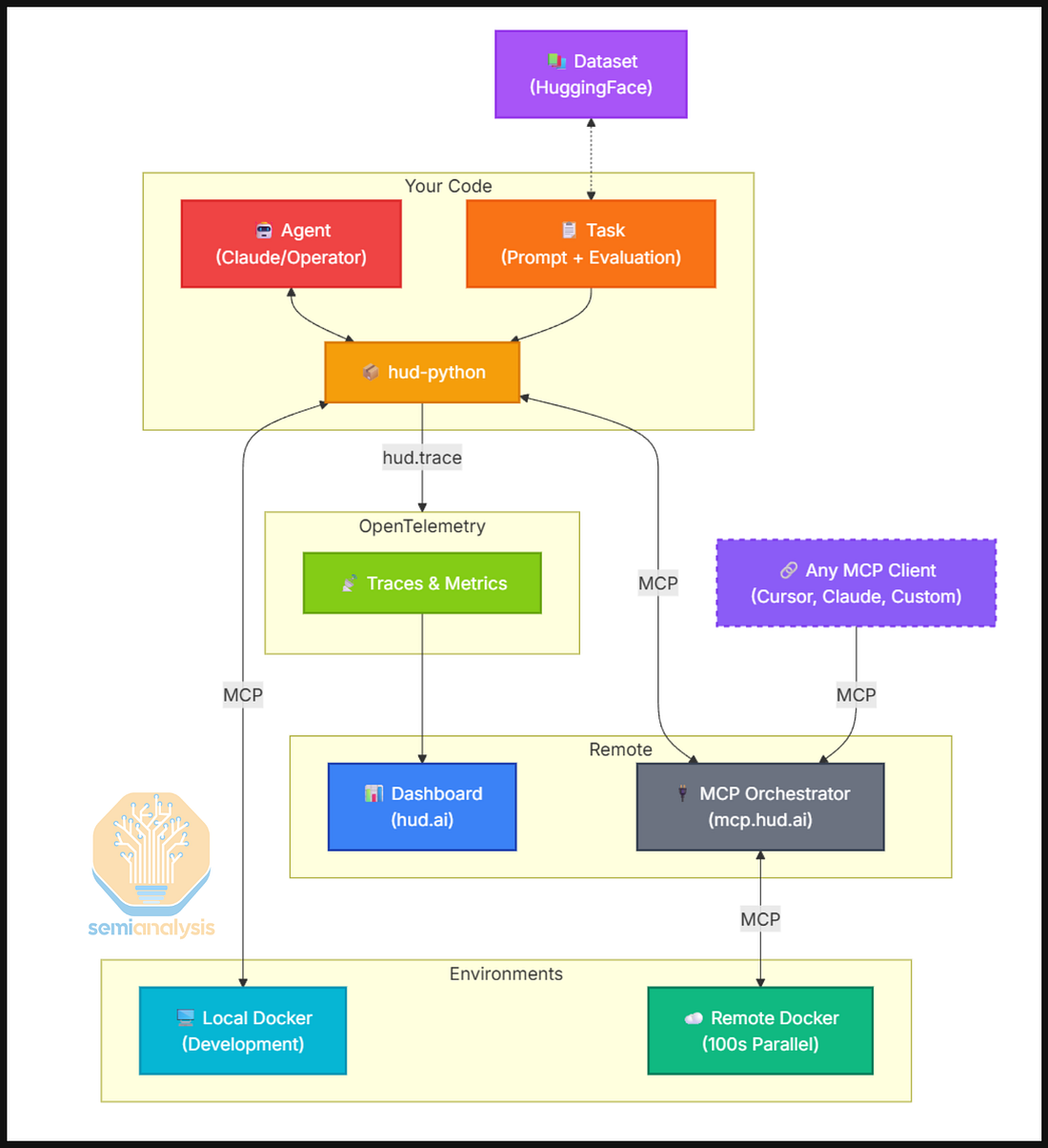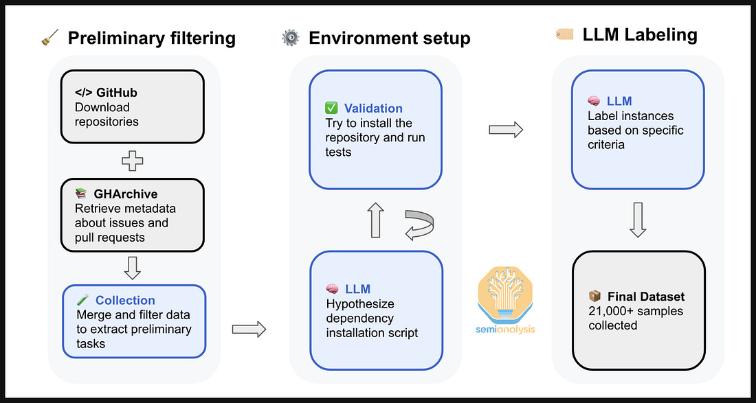 Other companies branched out into more sophisticated environments than just a website. Examples include Slack, Salesforce, AWS terminals, Microsoft OneDrive, Gmail, Discord, and Atlassian. The goal is for agents to autonomously operate in these software platforms, learning and better understanding how to navigate and operate within them. These platforms, once built, can be combined to represent higher fidelity tasks and workloads. Putting together platforms like Slack, an API endpoint to a browser, and a coding editor can construct an increasingly realistic software task for the model. This enables interactions to be more multi-turn as opposed to a single shot, for example pinging the model halfway through its process via Slack to request a feature change. Some of the companies building these sorts of environments, include Habitat, DeepTune, Fleet, Vmax, Turing, Mechanize, Preference Model, Bespoke Labs, and many others. Even within these companies there is significant diversity in quality or focus. Some companies focus on UI gyms, like Turing, while others like Mechanize focus on software engineering tasks. Almost all companies are seed stage companies with less than 20 employees, focused on 1 to 3 customers at most. Most aforementioned companies close source their environments and serve them in exclusive contracts to the labs. Some, however, like Prime Intellect open source theirs and are fostering the Environments Hub, which aims to be a one stop shop for RL environments. Others are building tooling for environments. HUD for example has tooling that allows for the wrapping any given software (e.g., a game, browser, google sheets) in a dockerized container, enabling its use as a scalable RL environment. Each container has two layers: the environment backend (the actual software being wrapped) and an MCP server that sits on top and exposes tool definitions the agent can call. When an agent issues a tool call like The highest in demand environments are coding environments. Understanding how these are built, structured, and assembled can provide a unique view into the infrastructure and engineering effort underpinning the progress we see today. So You Want to Make a Coding Environment?Demand for coding environments is so high that we believe defunct startups are getting acquired specifically for the value of another private GitHub repo to make environments out of. Understanding why these repos are so valuable requires understanding how coding environments are actually constructed. The process is more involved than it might seem. SWE-rebench is a benchmark that aggregates thousands of Python tasks from GitHub and showcases how these environments are constructed. The process it employs is also automated, which is what we expect the labs to be doing. The pipeline starts with downloading the GitHub Archive, containing 30k repos and 450k PRs with permissive licenses. This dataset is then filtered for several categories: PRs have to be resolved, merged to the main branch, have sufficient descriptions of the problem, impact more than one file, etc. PRs must introduce or modify test files as that is what is used for grading. For example, if a model’s patch causes previously failing tests to pass (without breaking others), the task is marked as solved. To automate environment configuration, an LLM generates installation instructions for each task. The model reads relevant files in the repository (README, setup.py, requirements.txt, Docker files), then synthesizes a structured JSON “recipe” specifying the Python version, dependency installation commands, and test execution commands.