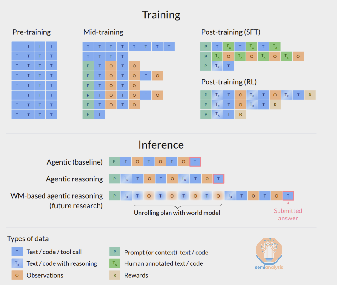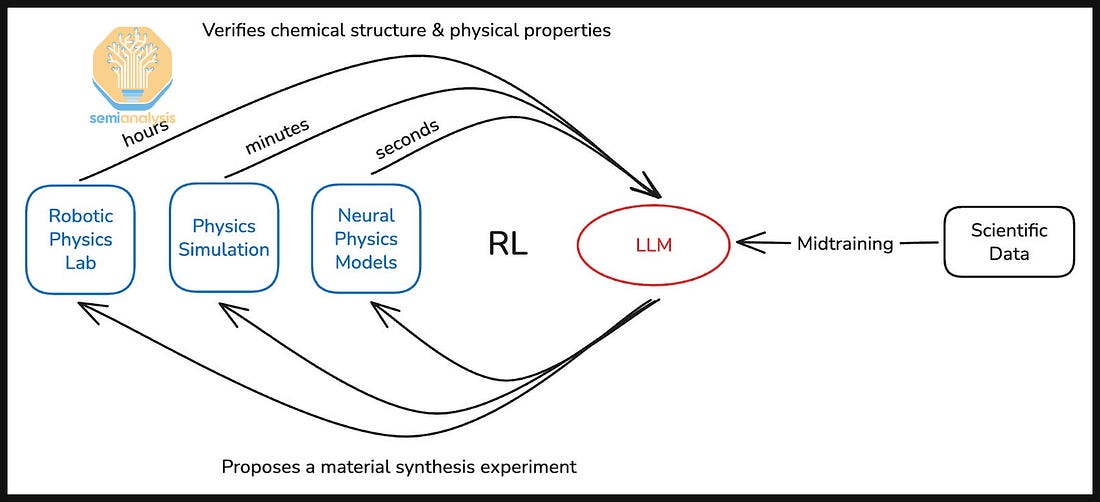 This process of testing ideas through increasingly high-fidelity methods to derisk experiments before running them in a lab maps roughly onto a graduate student’s typical workflow. Open-source models can be used as a starting point and mid-training can be done to extend capabilities. Mid-training is continued pre-training (next token prediction), which can be used for extending a model’s cutoff date, improving domain knowledge on specific topics, and or priming them for high compute RL. For example, when OpenAI models see a refreshed cutoff date, it is due to continued mid-training on top of the model. In highly specific scientific domains, mid-training will lead to higher quality models after post training. Meta, in their recent code specific model, found that the benefits of mid-training extended even after other stages (e.g., SFT) were applied. Meta used 1T tokens for mid-training for a recent model, but we expect OpenAI to be using somewhere between 5-10x more. An example of data that it added into the mid-training stage is environment trajectories from previous runs. These are the collected rollouts that were generated when a previous version of the model was undergoing RL. To supply data for RL and mid-training, Periodic is building a large physical lab to run experiments and produce experimentally verified reward signals. This is in line with other efforts, as DeepMind is also starting an automated materials science research lab in 2026. Running your own experiments yields complete knowledge of input variables and outcomes, something not guaranteed when training purely on published papers, which often disagree even with comparable metrics. Another domain which requires significant lab work is biology. It is also a domain in which the labs have had diverging approaches. RL Meets the Wet LabThere are two primary bottlenecks within biology: "how can promising drug candidates be identified faster" and "how can drug development be executed faster once candidates are found." OpenAI and Anthropic have both established pharma partnerships but are tackling different parts of this pipeline. OpenAI is targeting early-stage discovery, building systems that conduct the research themselves. Recently, OpenAI showcased GPT-5 operating in a closed loop: proposing protocol modifications, receiving experimental results, and iterating autonomously with no human in the loop. As part of this effort, OpenAI also had to set up basic robotic systems to conduct the experiments. Fundamentally, this aims to increase the rate at which useful candidates are found. Anthropic, on the other hand, is targeting the drug development and approval processes. Claude for Life Sciences is a platform with pre-built connectors linking directly to Benchling, 10x Genomics, PubMed, and other services scientists use. The goal is to be able to iterate faster on drug trials, for example. This is then neatly packaged in a solution ready to be shipped to enterprise companies, understandable essentially as a (functioning) Copilot for the Life Sciences. The core idea is to increase the speed at which documentation and approval happens. We think there is a likelihood both companies converge into tackling both domains, but the current split is revealing: OpenAI is chasing moonshot AI projects, while Anthropic is continuing with its more boring but practical enterprise plugs-ins and solutions. Long term potential will be revealed through each company’s speed of iteration and ability to take on more and more tasks in the pipeline. Implied within this is the need for large amounts of biological data to train models. While companies like Mercor will be happy to take money from the labs, those companies do not have the ML or physical infrastructure to supply large amounts of biological data. This is where we see a role for companies like Medra, who aims to supply large amounts of biological data to the labs. Medra aims to set up a robotically automated scientific lab focused on biology. The company does not plan to build foundation models or design drugs. Instead, they aim to build the experimental infrastructure and generate the validated data that foundation model companies need to train on. Like periodic, Medra aims to build their own lab with hundreds of robots. We believe robotics will enable more consistent results and faster iteration, driven by the closed loop described above, but there will be a steep learning curve as set ups are optimised and systems made more robust. Lab automation is a decades old problem and improvement is likely downstream of restricting scope as opposed to sudden breakthroughs. This further demonstrates how different post-training is to pre-training: if OpenAI choose a different set of experiments to optimise for versus Google DeepMind, then the resulting models and applications will be separate. The specialisation in these hyper specific domains cuts against the notion of model commodification and similarity. RL environments are spilling into the physical world. These environments are no longer just a docker container that can be arbitrarily spun up in software land. It is an experiment that needs to be run by a human or a robot, with a real cost to materials, electricity, equipment, and lab space. There are interesting implications to this, including that the marginal amount of data per dollar spent is drastically lower than in software. A single biological experiment can cost hundreds to thousands of dollars and take hours to complete, compared to a coding task that can be attempted 64 times and graded for a trivial cost. This drives up the need for more efficient algorithms and specific architectural decisions to make physical RL tractable. Why RL for Biology Can be ChallengingScientific experiments can vary wildly in time required for completion. In biology, plenty of experiments take days to complete. These longer timelines require long rollouts, meaning rewards will be sparse. Sparse rewards pr