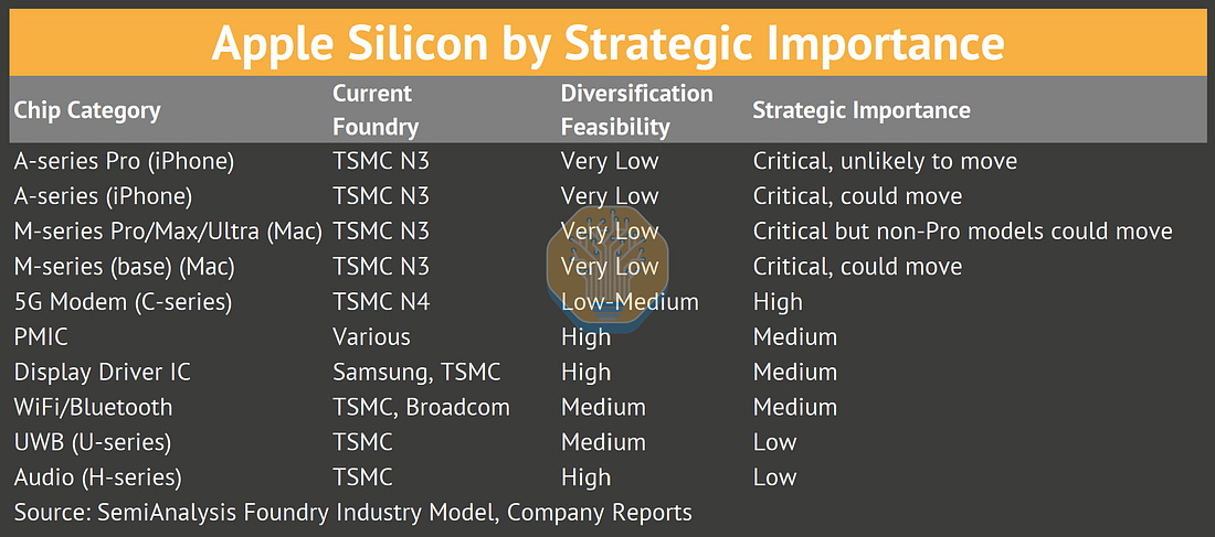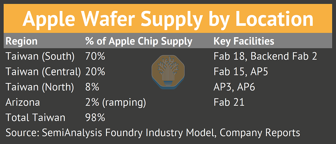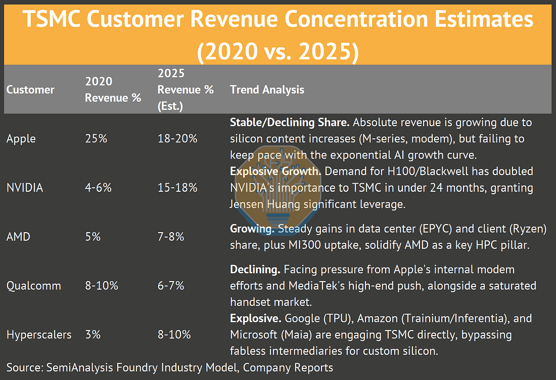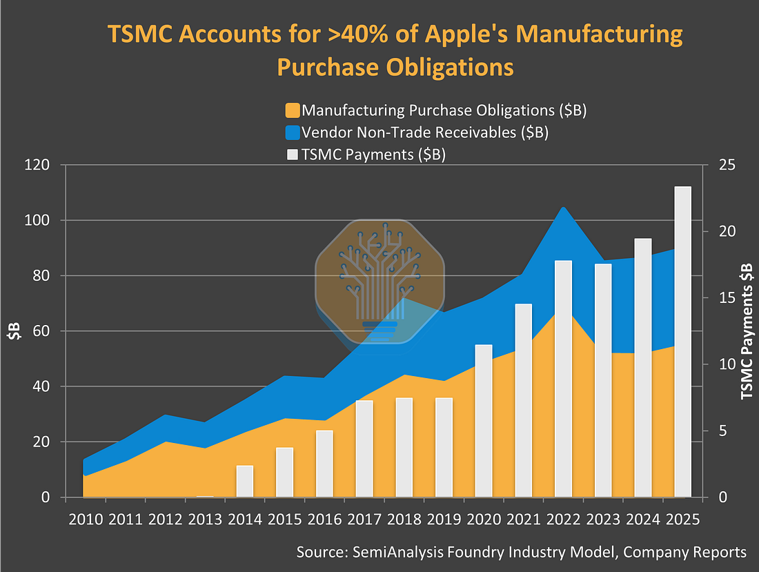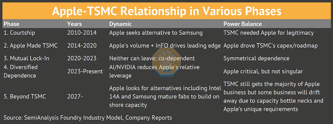 Apple-TSMC: The Partnership That Built Modern SemiconductorsWafer demand model, node economics, and the shifting power dynamics as AI reshapes the foundry landscapeIn 2013, TSMC made a $10 billion bet on a single customer. Morris Chang committed to building 20nm capacity with uncertain economics on the promise that Apple would fill those fabs. “I bet the company, but I didn’t think I would lose,” Chang later said. He was right. Apple’s A8 chip launched in 2014, and TSMC never looked back. Apple’s annual spend at TSMC grew from $2B in 2014 to $24B in 2025. That is 12x in 12 years. Apple went from 9% of TSMC revenue to 25% at its peak and settled to 20% in 2025. More striking is Apple’s dominance at node launches: consistently >50% since 20nm and in some cases near 100%. Apple effectively funded the yield learning curve for every major node transition since 20nm. The foundry model is dominant today. IDMs cannot support process development and fab capex with what is effectively a single customer. But even foundries need a “first and best” customer with large demand and deep pockets to fund their continued advance. Apple has been that customer for the last decade at TSMC. The juggernaut partnership has propelled both companies to new heights, put competitors in the dust, and fueled the chipmaking industry. This report traces the Apple-TSMC relationship from Intel’s 2010 rejection through five distinct phases, examining how Apple built its chip empire through acquisitions and 8,000+ engineers across 15 design centers. We analyze why competitors have failed to replicate this vertical integration, map Apple’s manufacturing footprint across Fab 18 and advanced packaging facilities, and assess the strategic questions facing both companies as Intel 18A and Samsung re-engagement become viable alternatives. We’ll also discuss the next phase of the relationship. It’s not just Apple at the leading edge anymore. All of this is quantified with specifics from our proprietary Foundry Industry Model and Apple Wafer Demand Model. Anchor TenantYou can see the Apple effect in TSMC’s capex trajectory. Pre-Apple (2005-2009), annual spending averaged $2.4B with no anchor tenant to de-risk investment. From 2019-2022, TSMC deployed $98B, exceeding the cumulative spend of the prior 14 years. Apple’s manufacturing purchase obligations scaled from $8.7B in 2010 to $71B in 2022. TSMC-specific payments grew from near-zero in 2013 to $23B+ in 2025. For over a decade, Apple was the only company capable of pre-funding bleeding-edge capacity at scale. That changed with Nvidia’s AI-driven cash generation. Today, two companies can fund TSMC’s roadmap. The platform shift has already happened. HPC revenue at TSMC grew from 36% in 2020 to 58% in 2025. Smartphone revenue shrunk to 29% from 46%. Our model shows Nvidia will consume more N3 wafers than Apple by 4Q27. Apple’s share of N2 drops to 48%, the first time in a decade Apple is not the dominant customer on a new node. Consensus sees this as permanent displacement. Our model says otherwise. TSMC’s A16 is architected for HPC. Backside power delivery, gate-all-around transistors, and thermal envelopes are optimized for HPC and smartphones will skip this node. Nvidia benefits disproportionately. Apple’s N2 (N2 + A16) share drops not because Apple lost leverage, but because the node was built for a different customer. A14 (1.4nm) rebalances the equation. TSMC is designing A14 for both mobile and HPC from the start, with a separate backside power (TSMC’s trade name is Super Power Rail) variant for HPC. Our model shows Apple reclaims 67% node share on A14, its highest since N3. Apple is not standing still. New chip families (N-series, C-series) account for 15% of wafer demand by 2030. iPhone’s share of Apple’s wafer mix fell from 74% to 57% as Mac silicon and custom chips scaled. Gross margins reflect in-house silicon transition. Mac GM expanded from 28.5% to 39.5% after ditching Intel, an 11-percentage point expansion. iPhone GM grew 5 percentage points from A4 to A18. Annual chip savings exceed $7B across Intel, Qualcomm, and Broadcom displacement. Apple has driven $300B+ in supplier capex over the past decade, building a supply chain empire that spans Foxconn, ASML, and dozens of precision manufacturers. What This Analysis Covers The analysis is built on two proprietary models. Our Foundry Model tracks revenue, wafer shipments, and capacity allocation, quantifying the platform shift where smartphone revenue fell from 46% to 29% while HPC rose from 36% to 58%, and how Apple’s purchase obligations grew from $8.7B to $71B. Our Apple Wafer Demand Model forecasts silicon demand across chip families (A-series, M-series, S-series, N-series, C-series etc.), calculates gross margin savings exceeding $8B annually, and projects Apple’s leading-edge share declining from near 100% at N3 to <50% at N2 as AI accelerators reshape allocation. The report concludes with Taiwan risk scenarios, Arizona economics, and conditions under which Apple would build its own fabs. Key NumbersWafer Demand · A-series: $4.2B (2018) to $9.7B (2025) = 131% growth · M-series: $0 (2019) to $4.9B (2025) = From zero to $5B in 6 years · S-series: $86M (2018) to $342M (2025) = 4x growth · Total Apple Silicon Revenue: $23.5B (2025) TSMC Transformation: · Revenue: $13B (2010) to $122B (2025) = 9.4x growth · R&D: $1B (2010) to $8B+ (2025) = 8x growth · Capex: $5.9B (2010) to $41.4B+ (2025) = 7x growth · Gross Margin: 45.5% (2010) to 59%+ (2025) = 13.5pp expansion The Packaging Revolution: · CoWoS Revenue: $0.6B (2018) to $8.4B (2025) = 14x growth · Apple InFO Revenue: $3.5B+ (2025) · TSMC Advanced Packaging as % of Revenue: 6-7% (2018) to 10%+ (2025) Apple’s Supply Chain Leverage: · Manufacturing Purchase Obligations: $8.7B (2010) to $56.2B (2025) = 6.4x growth · Monthly Wafer Demand: 19K (2013) to 130k (2025) = 7x growth · Fab 18 Customers: 4 (2020) to 45 (2